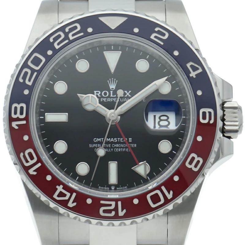 | ロレックス人気モデル「GMTマスター2」のモデルチェンジした新型モデルです。セラミックベゼルにブレスやバックルも新しくなり高級感が更に増した1本です。 |