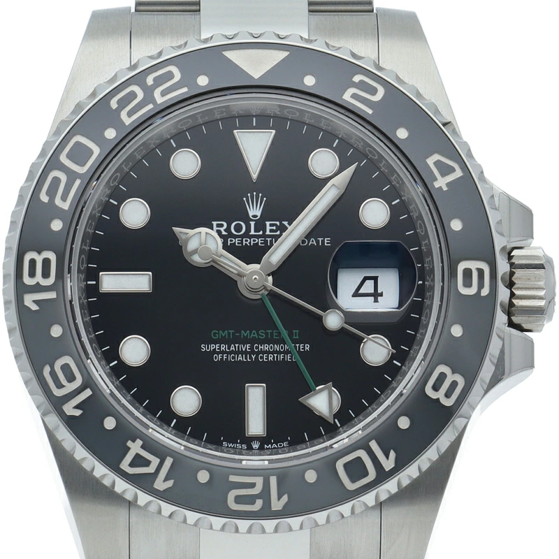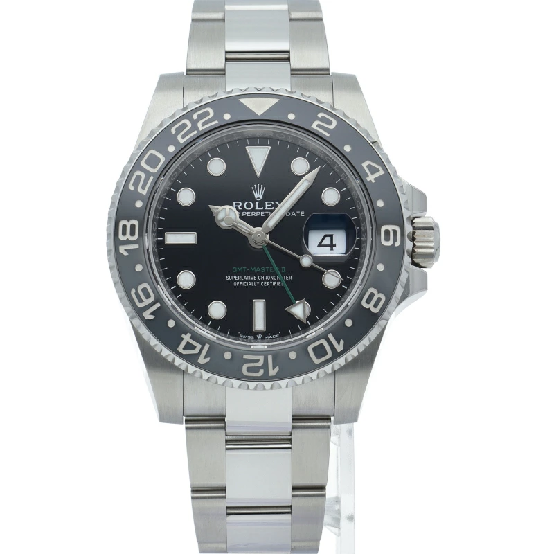 | 2024年に新たに加わった、グレー/ブラックベゼルにステンレスのケース/オイスターブレスレットの【126710GRNR GMTマスターII】。キャリバー3285はロレックスが特許を取得したクロナジーエスケープメントを採用し、高いエネルギー効率により70時間ものパワーリザーブを誇ります。 |