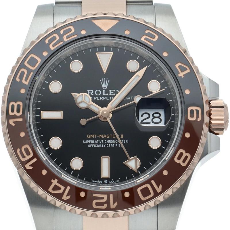 | セラクロムベゼルでのGMTマスター2。ロレックスの最新ムーブメント「Cal.3285」を搭載しており、エネルギー効率が最適化されたクロナジー脱進機、テンプを衝撃から守る為の耐震装置パラフレックス ショック・アブソーバそして70時間ものロングパワーリザーブとロレックスの最新技術を駆使したムーブメントになっています。 |