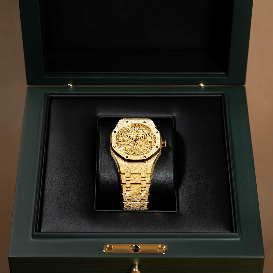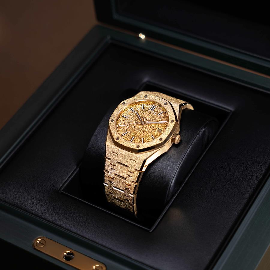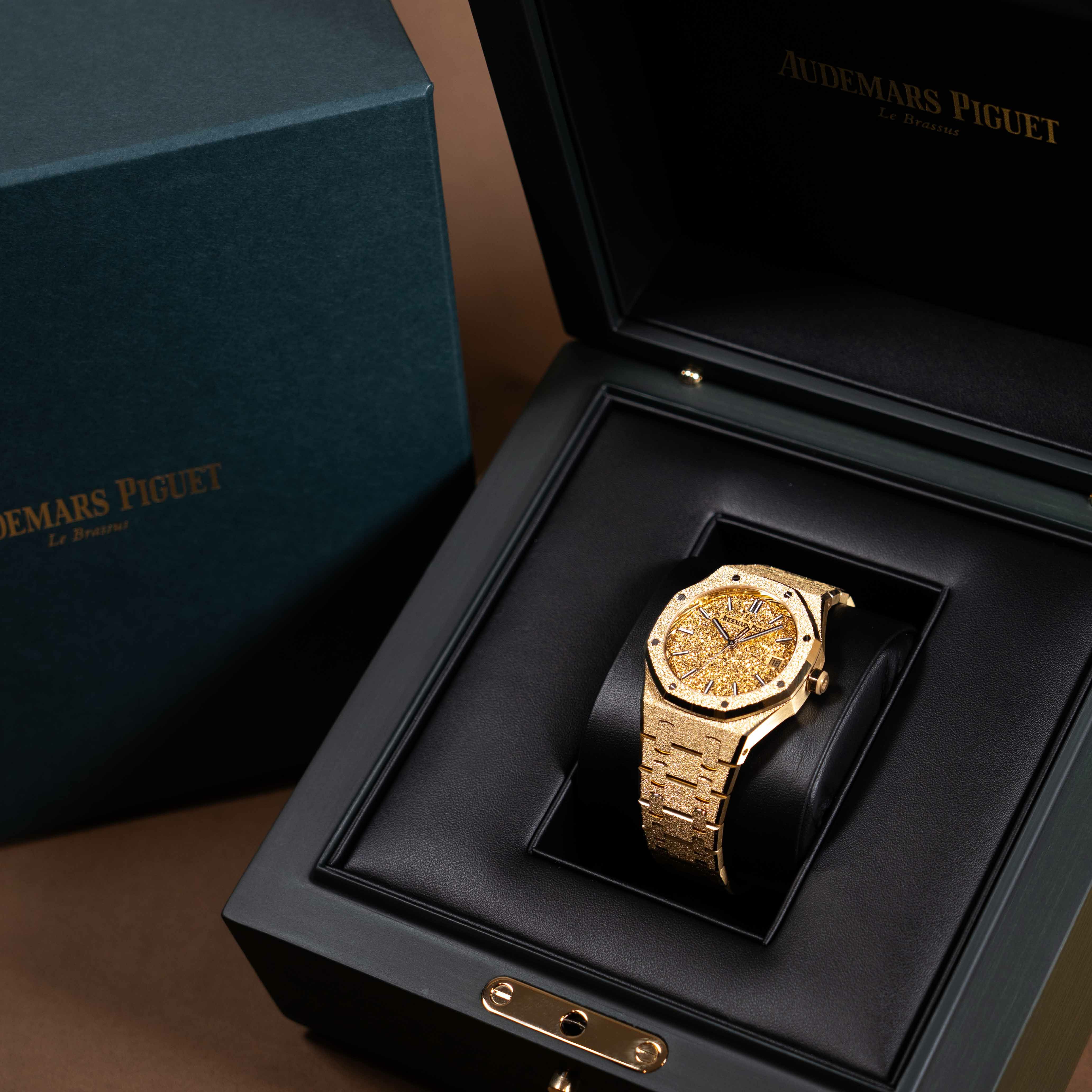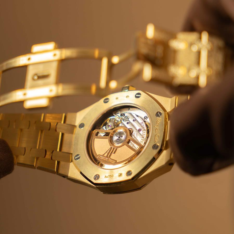 --------【商品スペック】--------お問合せコード: 77450BA.GG.1361BA.01ブランド:オーデマ・ピゲシリーズ:ロイヤルオークケース素材:イエローゴールドベルト素材:イエローゴールドダイアルカラー:イエローゴールドムーブメント:自動巻(Cal.5800)ケースサイズ:34mm(リューズ除く)防水:50mガラス:サファイアガラス仕様:日付表示、3針、バックスケルトン付属品:純正BOX、国際保証書保証:購入日より3年保証メーカー希望価格:¥9,405,000-込