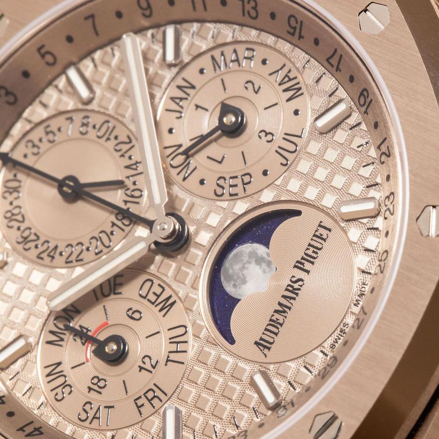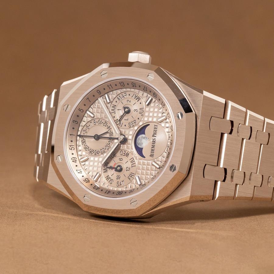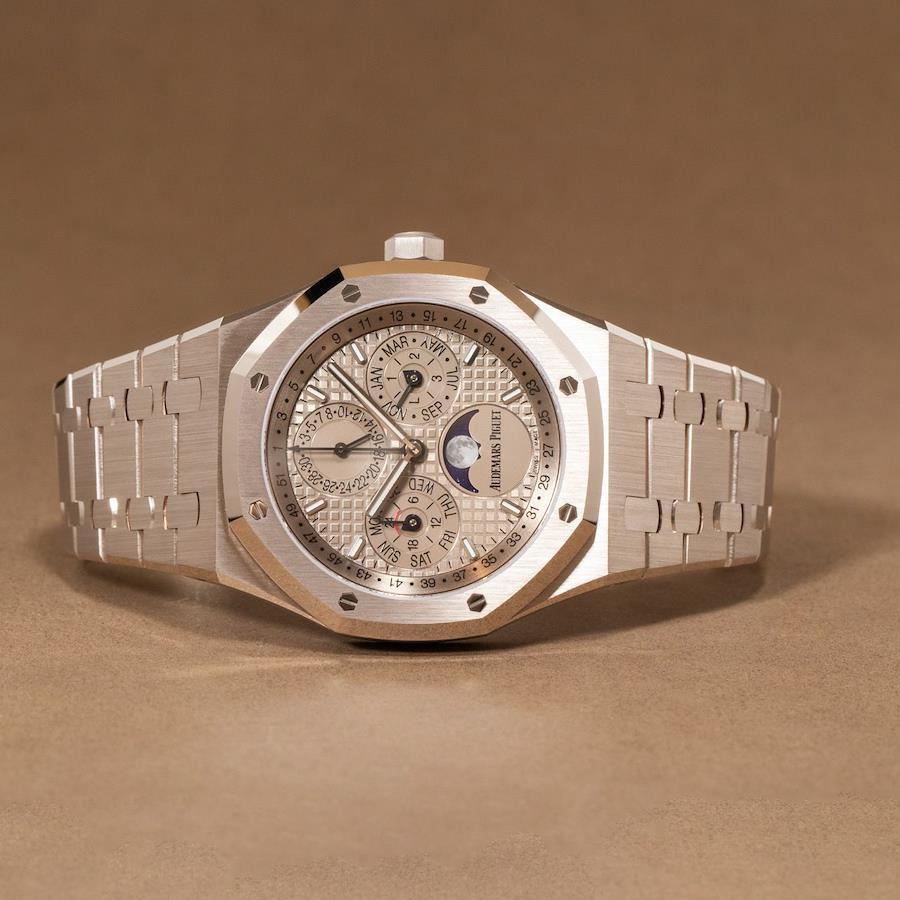 --------【商品スペック】--------お問合せコード:26674SG.OO.1320SG.01ブランド:オーデマ・ピゲシリーズ:ロイヤルオーク パーペチュアルカレンダーケース素材:サンドゴールドベルト素材:サンドゴールドダイアルカラー:サンドゴールドカラームーブメント:自動巻き(Cal.7138)ケースサイズ:41mm(リューズ除く)防水:50mガラス:サファイアガラス仕様:パーペチュアルカレンダー(曜日、日付、ムーンフェイズ、月、閏年)、2025年新作付属品:純正BOX、国際保証書(2025年)保証:当店購入日より3年保証