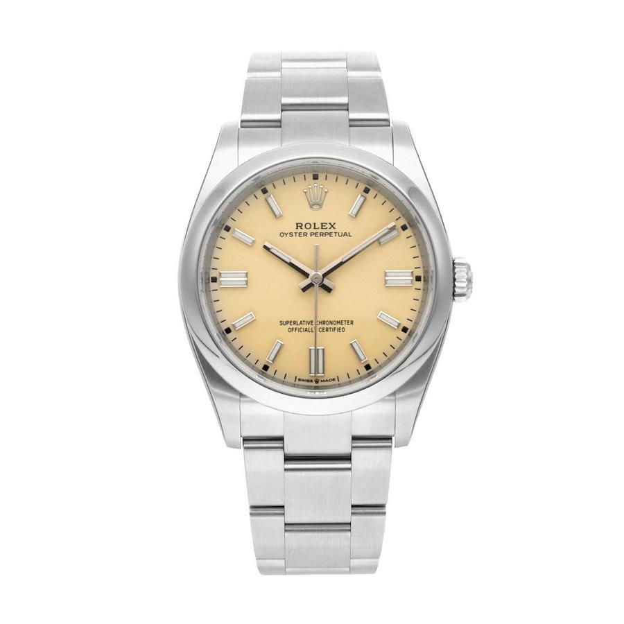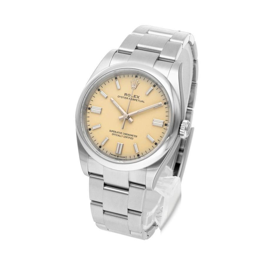 --------【商品スペック】--------お問合せコード:126000 ベージュブランド:ロレックスシリーズ:オイスターパーペチュアルケース素材:ステンレススチールベルト素材:ステンレススチールダイアルカラー:ベージュムーブメント:自動巻(Cal.3230)ケースサイズ:36mm(リューズ除く)防水:100mガラス:サファイアガラス仕様:3針付属品:純正BOX、国際保証書(2025年9月)保証:当店購入日より3年保証