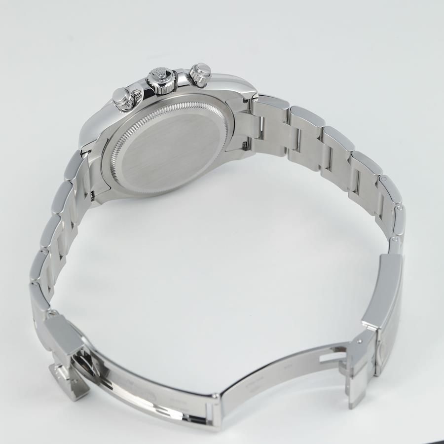 伝統的なデザインコードはそのままに、ケース、文字盤、クラスプなどがアップデートされています。旧型116500LNと違う点は、126500LNのセラクロムベゼルは縁部分がメタルになっており、インデックスが細めのデザインに変更されています。インダイアルが細くなり、ラグの形状と長さも変更。126500LNはラグが横から覗くと切り立ったデザインとなっており、それに伴い長さも短くなっています。6時位置のSWISS MADEの間に王冠マークが備えています。