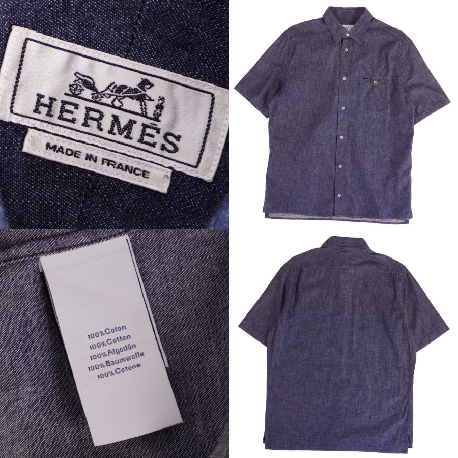 エルメス HERMES シャツ デニムシャツ ショートスリーブ 半袖 コットン ラムレザー トップス メンズ フランス製 インディゴブルー サイズ40(15 3/4)