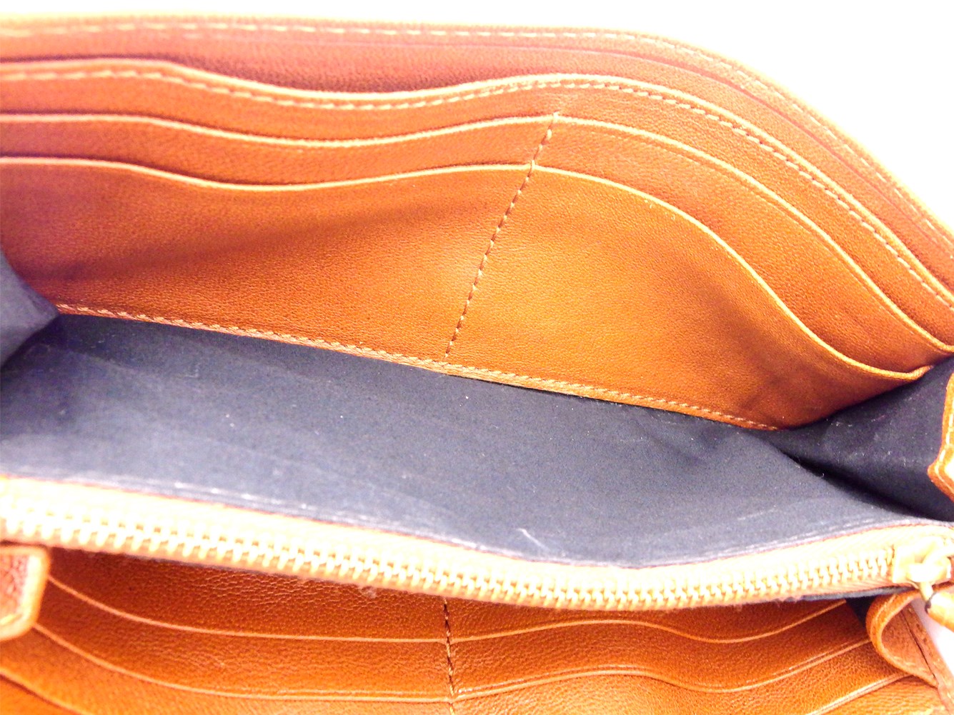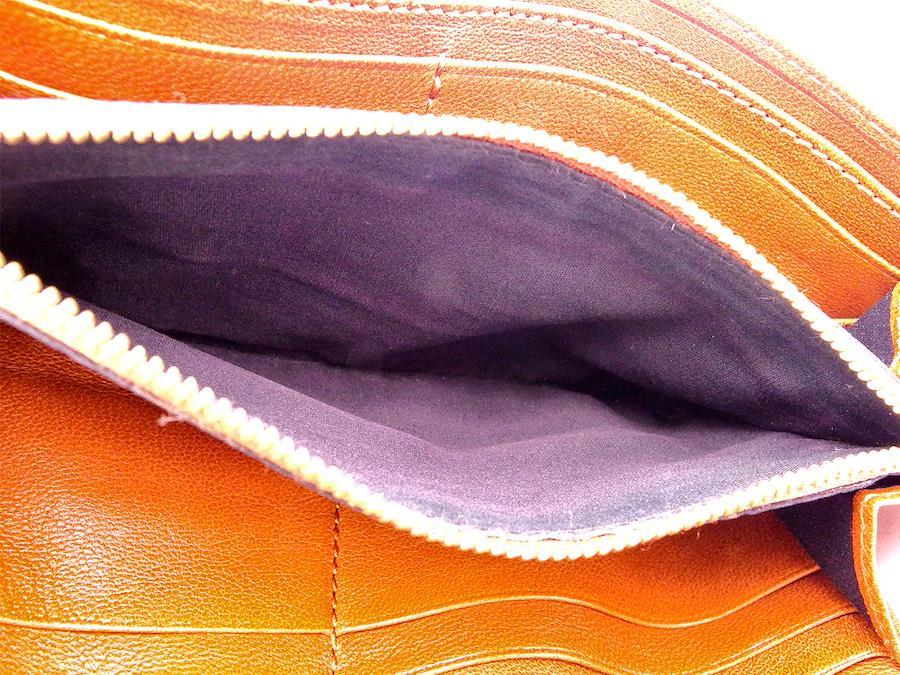 コンディション全体の状態詳細:まだまだお使いいただけます。社外リペア跡(スレ色着色)あり。その他 スレ&汚れ(内側&札入れ&小銭入れ&カード入れ&ポケットもあり) 傷小(内側) 角スレ シミ 金具ハゲ ファスナー少し重め コバヒビ割れ小(ファスナープル革) など使用感があります。