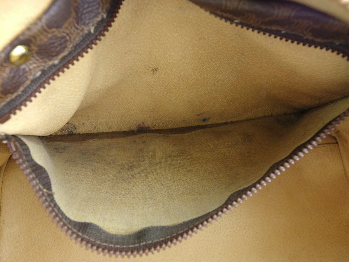 社外リペア跡(角パイピング切れコーティング)あり。その他 スレ&汚れ(内側&ポケットもあり) 傷 黒ずみ(ハンドル) 金具ハゲ インクシミ(内ポケット) ハンドル中芯折れ(一部) などの使用感があります。