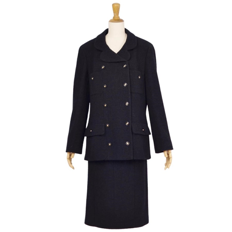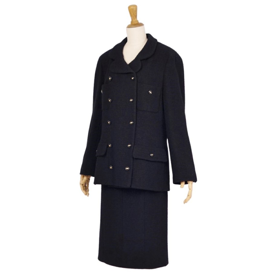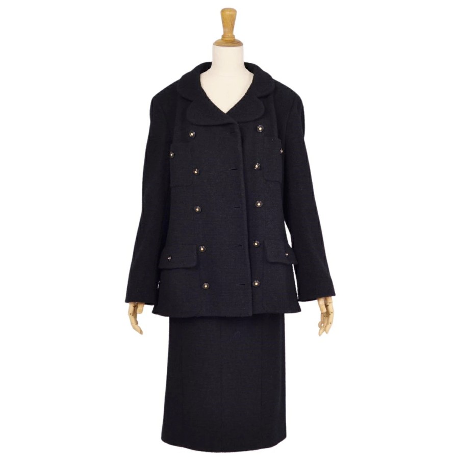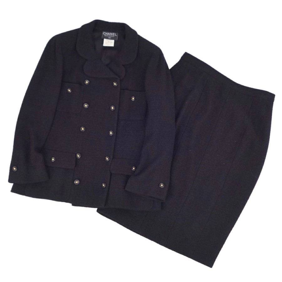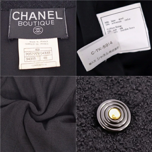 [Excellent Condition] Vintage Chanel 95A Suit Set (Jacket & Skirt) with Coco Mark Buttons, Made in France, Women's Size 46 (Equivalent to XL), Black [Pre-owned]