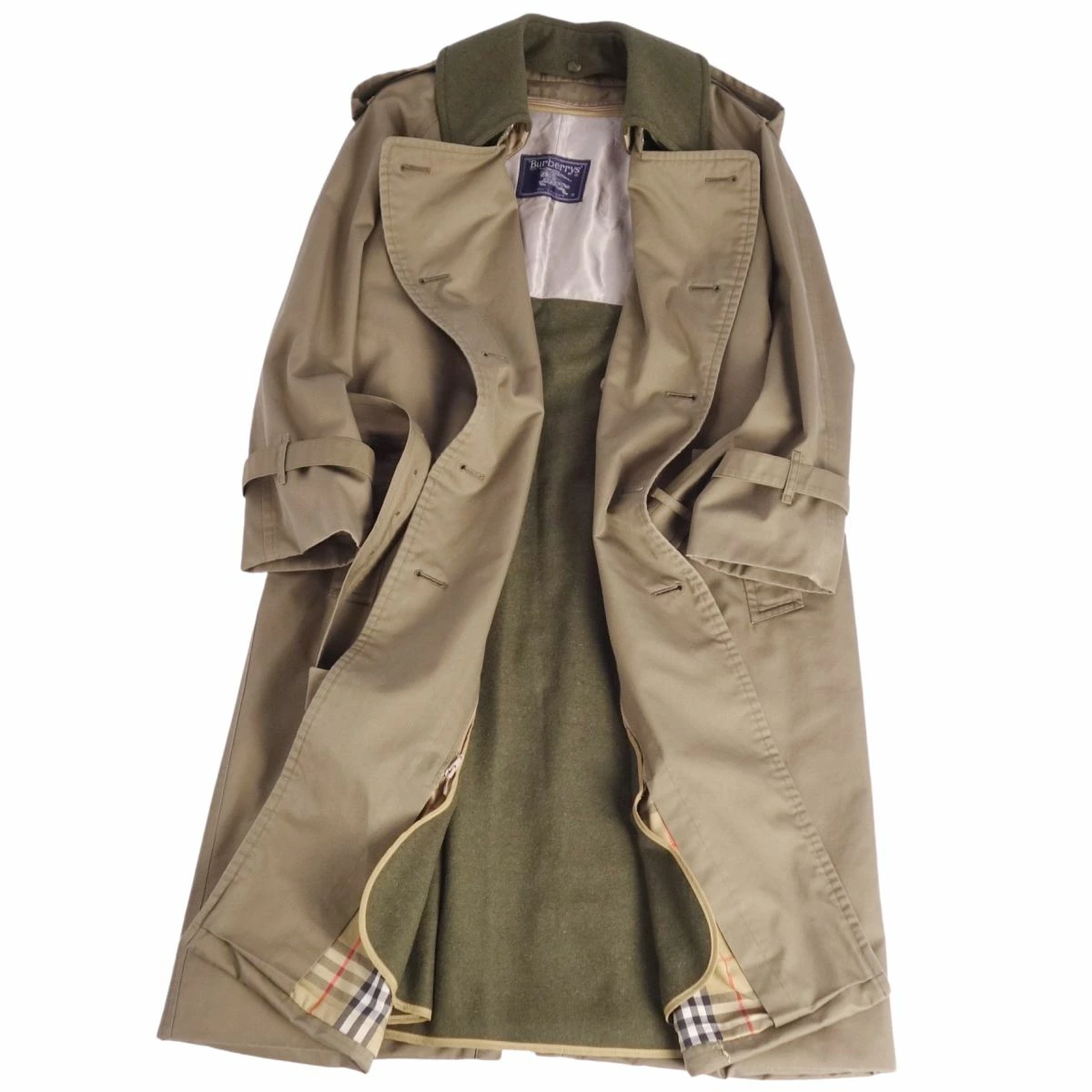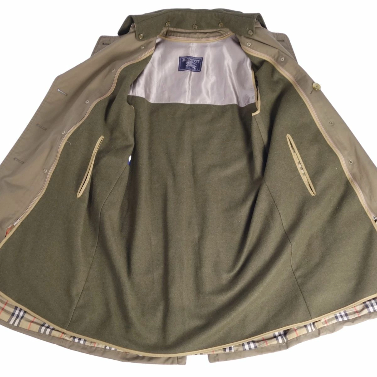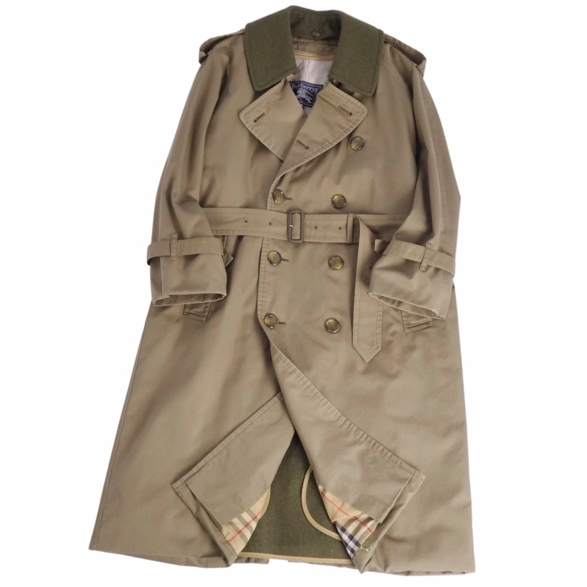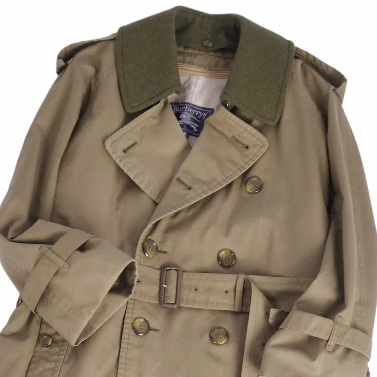 ■商品名Vintage バーバリー Burberrys コート 2枚襟 ライナー付き トレンチコート コットン 裏チェック アウター メンズ カーキ サイズ36(M相当)■状態説明・希少かつ絶大な人気を誇る1980年代頃のVintage Burberrys、クラシカルで美しいシルエットが魅力的な王道トレンチコートです♪・表地はコットンギャバジン、裏地はチェックデザイン、希少な襟ライナー付き、肩パット無しで美しいショルダーラインです◎・USEDですが気になるようなキズや汚れなどはなく全体的にキレイな状態です!【季節感:】【付属品:なし】■素材表地:コットン51% ポリエステル49% 裏地:コットン/ポリエステル■カラーカーキ■表記サイズ36(M相当)■実寸サイズ着丈:約110cm身幅:約60cmゆき丈:約80cm袖丈(脇下から):約41cm肩幅(エポレット~エポレット):約53cm■状態ランクA 使用感の少ない全体的にキレイなUSED品■店舗管理番号ce04mn-rm10e30388 mens_m