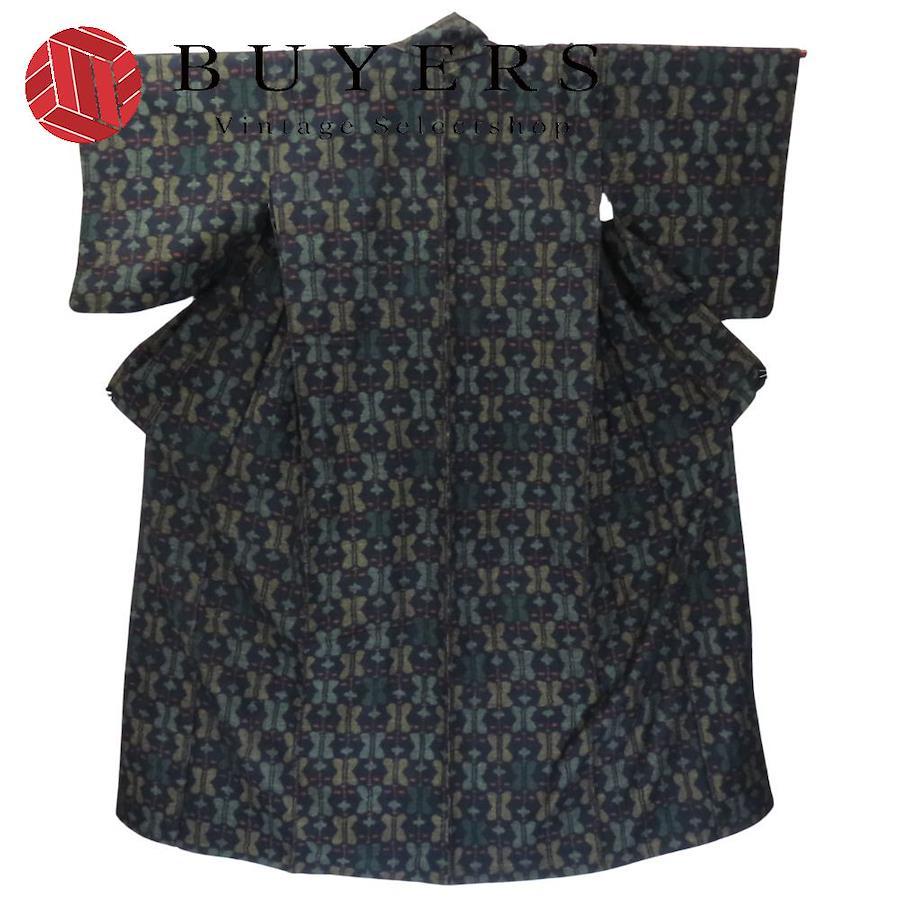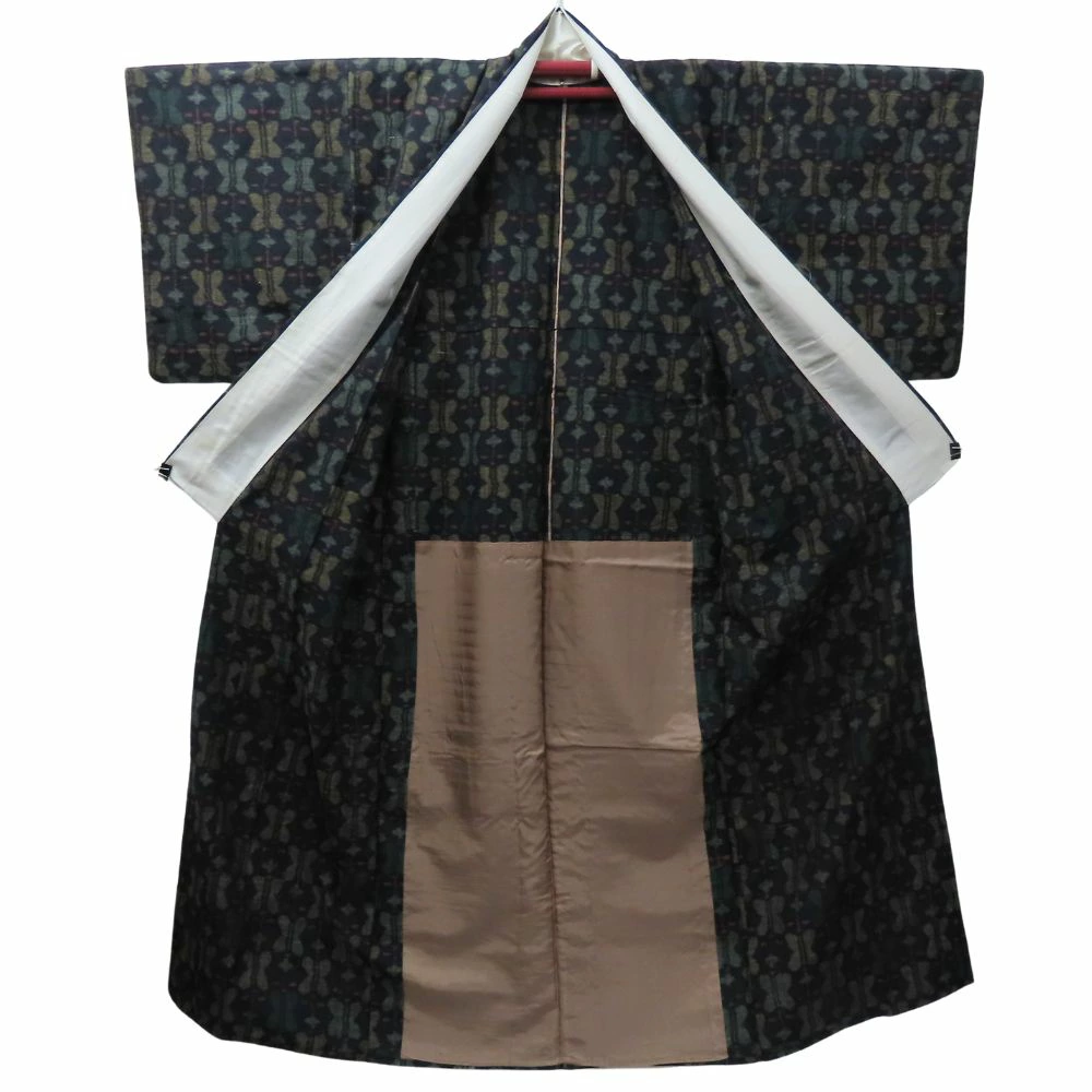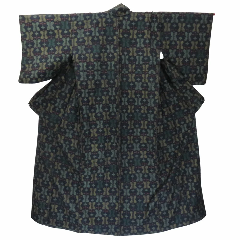| 品名 | 【中古】 紬 正絹 ブラック グリーン系 マルチカラー 洒落 単衣 総柄 レディース 女性 |