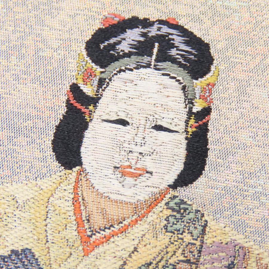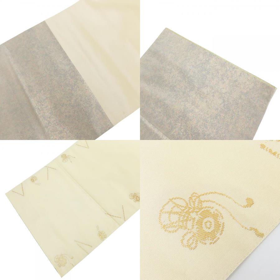 | 品名 | 【中古】 袋帯 お太鼓柄 正絹(金銀糸除く) 金糸 ゴールド系 グレー系 マルチカラー 人物草花文 能 引き箔 レディース 女性 |