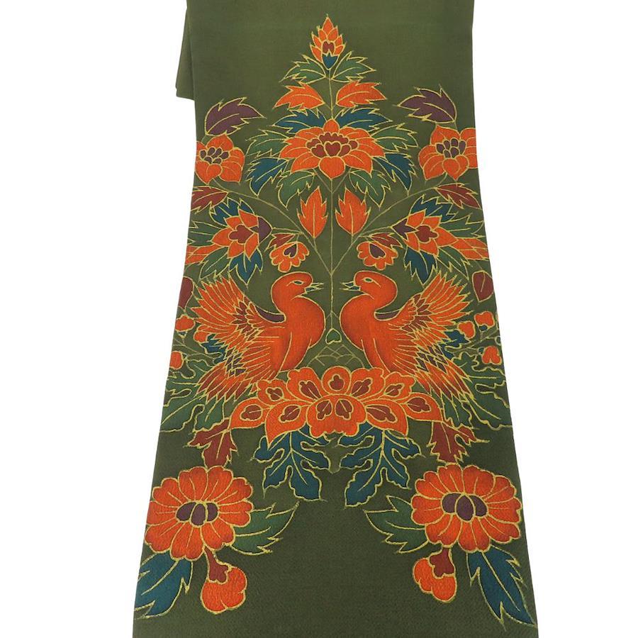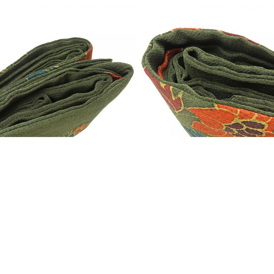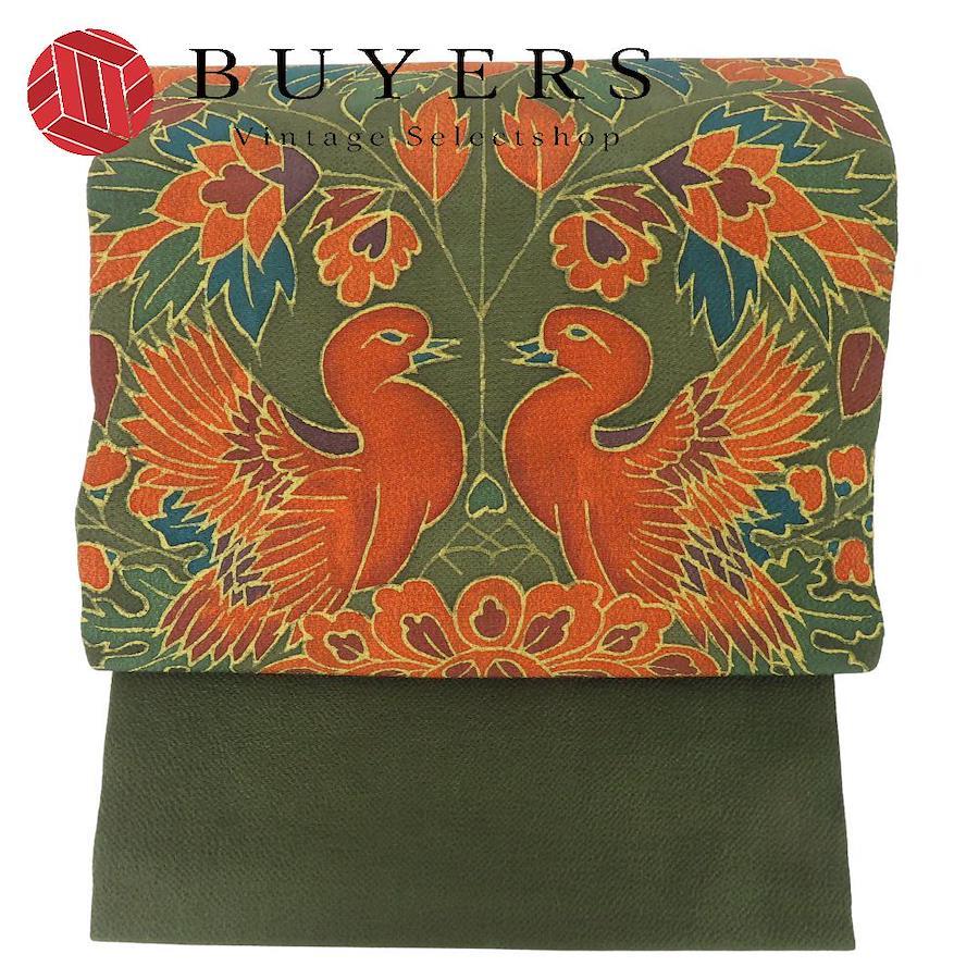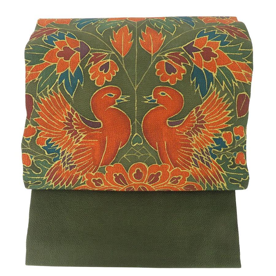 | 品名 | 【中古】 名古屋帯 染め 九寸 正絹(金銀糸除く) ダークグリーン系 オレンジ系 名古屋仕立て 双鳥文 ちりめん レディース 女性 |