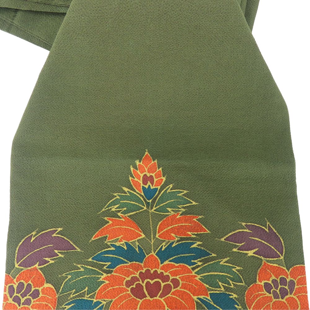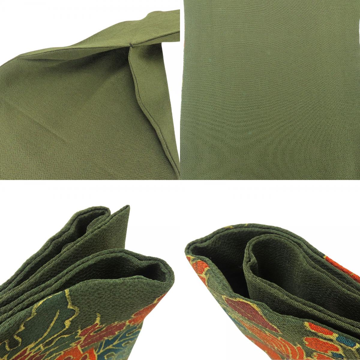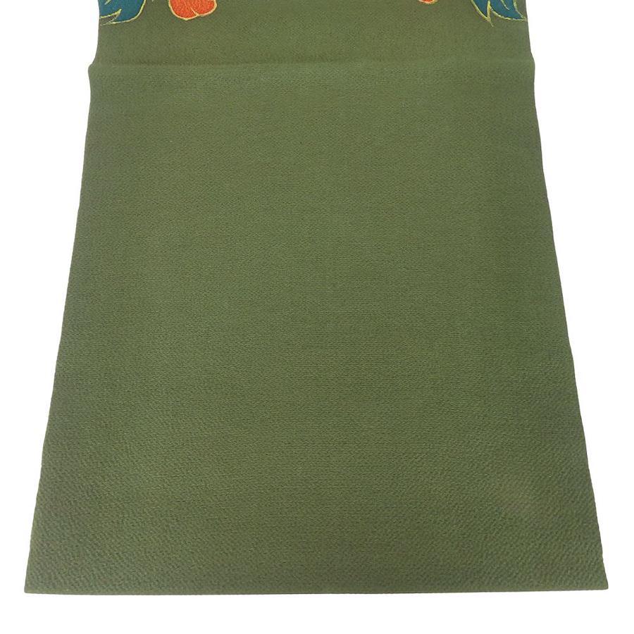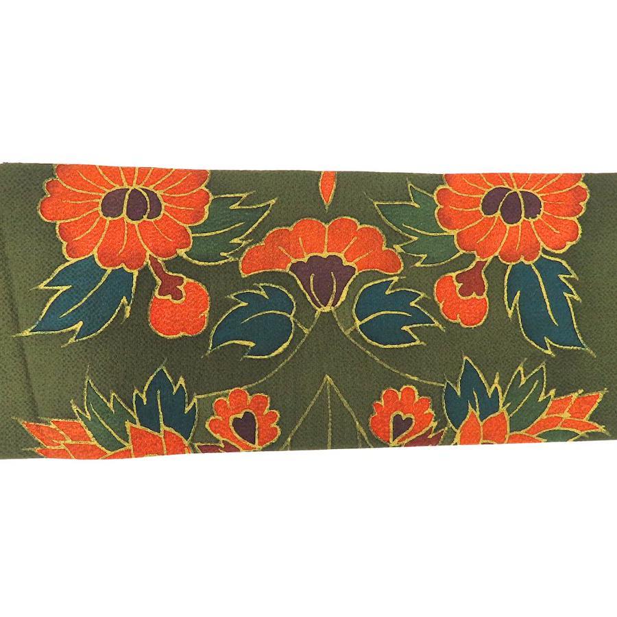 | 品名 | 【中古】 名古屋帯 染め 九寸 正絹(金銀糸除く) ダークグリーン系 オレンジ系 名古屋仕立て 双鳥文 ちりめん レディース 女性 |