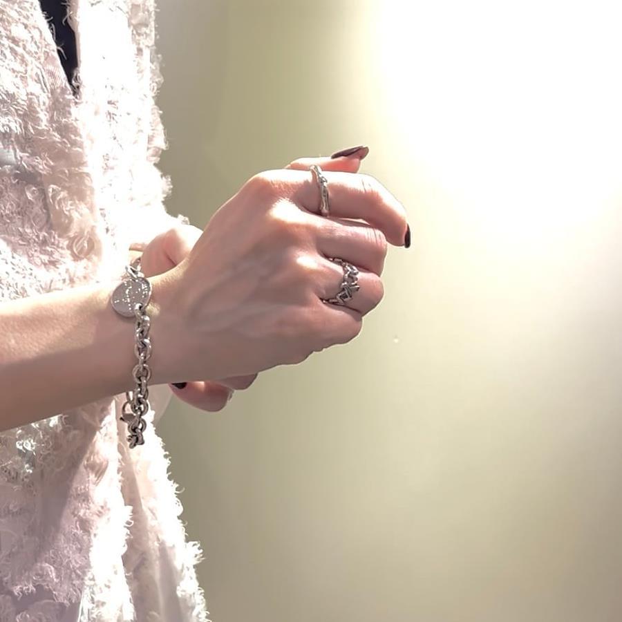 ・手元を印象づける立体的なチェーンと存在感のあるオーバルタグ。