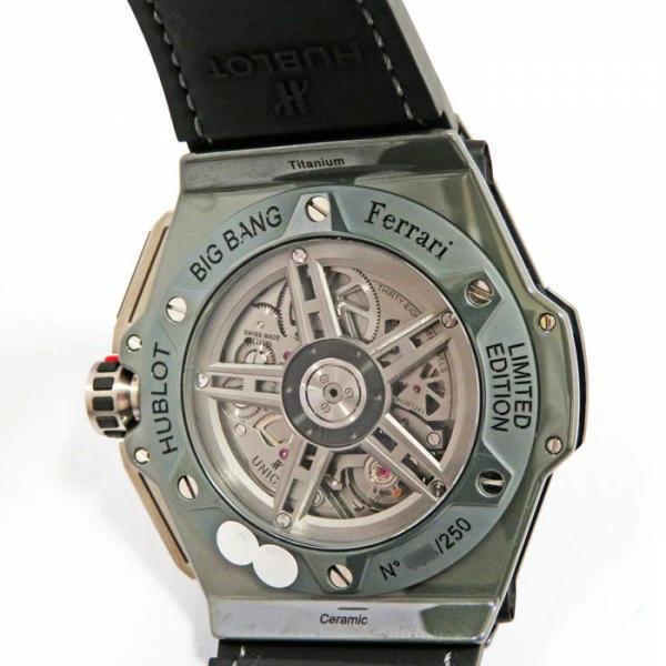 お問い合わせ商品IDW165130ブランドウブロ商品名ウブロ HUBLOT ビッグバン フェラーリ スペチアーレグレー セラミック 世界限定250本 401.FX.1123.VR ブラック文字盤 新品 腕時計 メンズ型番401.FX.1123.VR文字盤色ブラック文字盤種スケルトン素材セラミックレザーxラバー革サイズケースサイズ: 45.0mmムーブメント自動巻き機能クロノグラフデイト表示防水100m防水当店保証ご購入日より2年付属品国際保証書(ギャランティー) 有り純正ボックス 有り取扱説明書 有り商品状態[ 新品 ]※詳細はお問い合わせください。商品説明ケース径45mmのビッグバン フェラーリ チスペチアーレグレー セラミック「401.FX.1123.VR」。イタリアを代表する自動車ブランドであるフェラーリ。卓越した技術と研ぎ澄まされたデザインで世に発信し続ける両者は2011年にコラボレーションを開始しました。ケース素材にはセラミックとカーボンを採用し、ウブロのアイデンティティである「フュージョン(融合)」をいかんなく発揮。ダイヤルの9時位置にはフェラーリの代名詞である「跳ね馬」が象られています。その他にもプッシュボタンのロゴやラバーベルト、ホイールを模したローターなど、随所にフェラーリの魂が込められたスペシャルな世界限定250本モデルです。ご注文・ご来店前にご確認くださいませご来店購入をご希望の場合は、ご来店前に在庫の確認をお願いいたします。当サイトの商品は、実店舗でも販売しておりますので、あらかじめ在庫のご確認をお願いいたします。売り切れの際はご注文をキャンセルさせていただきます事ご容赦くださいませ。流通事情などにより付属品の一部がご提供できない場合がございます。商品によってはマイナーチェンジなどにより、掲載画像と現物に差異がみられることがございます。ご使用のパソコン環境により、掲載画像と現物の色合いに若干差異がみられることがございます。予告なく価格が改定される場合がございます。返品について通信販売にてご購入いただきました商品は、品質・梱包に万全を期しておりますが、万が一ご到着時に破損・不具合がございましたら2日以内にご連絡をお願いいたします。未使用の場合に限りご返金させていただきます。なお、上記以外の理由やお客様都合、ご使用済みの商品のご返品はお受けいたしかねます。
