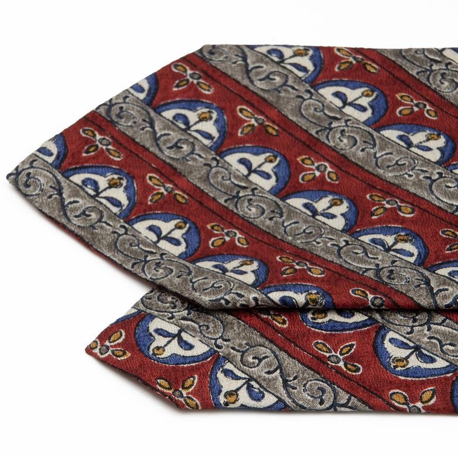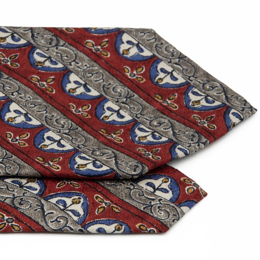情熱的なレッドと、落ち着いたグレーのストライプの中に、まるで古典芸術のような緻密な模様が織りなす、大変格調高い一本です。