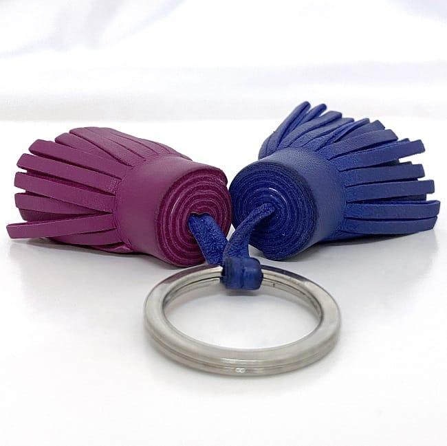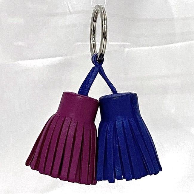 エルメス キーホルダー カルメン ec-23640 ブルー ピンク 美品 レザー 中古 HERMES タッセル チャーム キーリング ダブル フリンジ 紫 青 定番 人気 メンズ レディース アクセサリー ブランド小物 ヴィンテージ 鍵 ホルダー ブランド 本物 鑑定済み