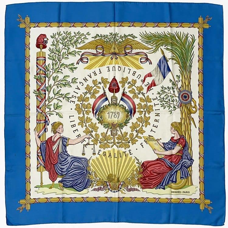 Hermes Scarf Carré 90 Blue White Commemorating the French Revolution Large Cleaned 100% Silk Used HERMES FRATERNITE REPUBLIQUE FRANCAISE 1789 Blue Classic Popular Men's