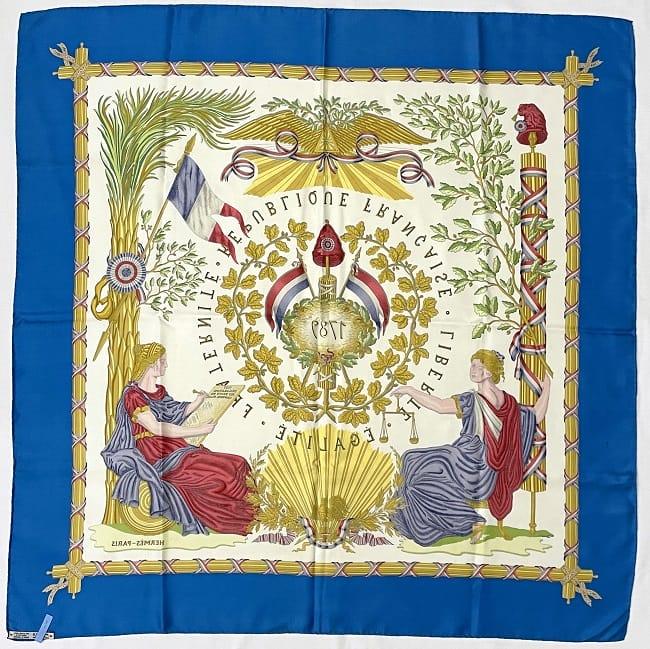 エルメス スカーフ カレ 90 ec-23644 ブルー ホワイト フランス革命を記念して 大判 クリーニング済み シルク 100% 中古 HERMES FRATERNITE REPUBLIQUE FRANCAISE 1789 青 定番 人気 メンズ レディース 衣類 アンティーク インテリア ブランド 本物 鑑定済み