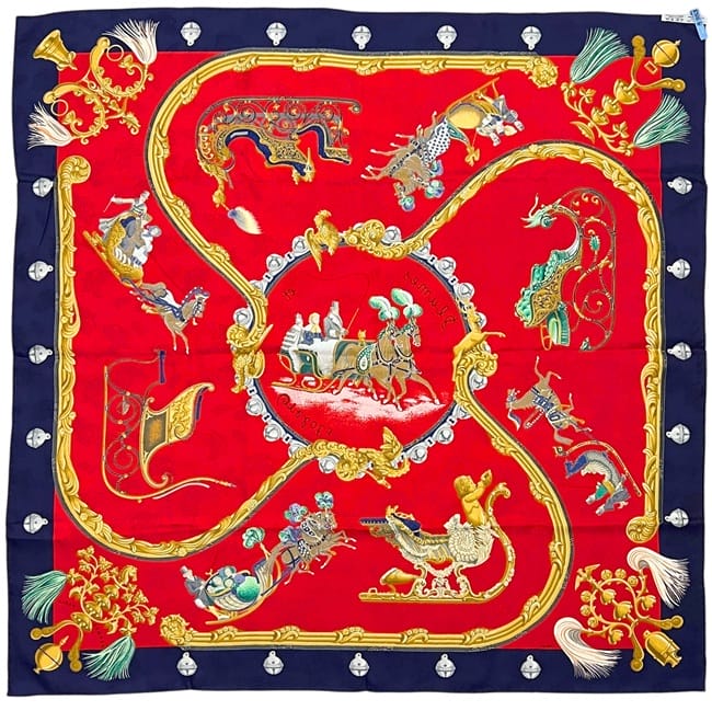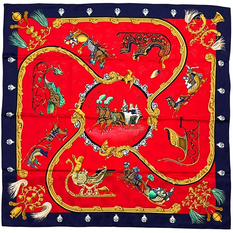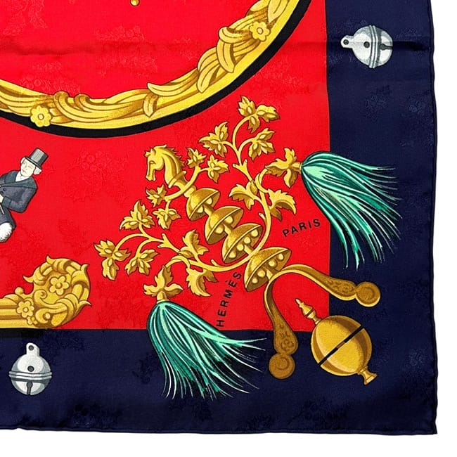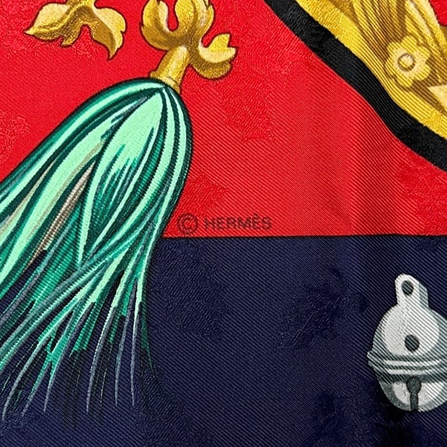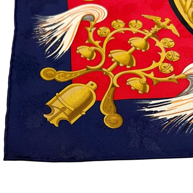 ☆---- 商品について ----☆エルメス スカーフ カレ90 ec-25416 レッド ネイビー 赤 紺色 羽飾りと鈴 美品 クリーニング済み 大判 シルク 100 中古 HERMES