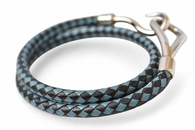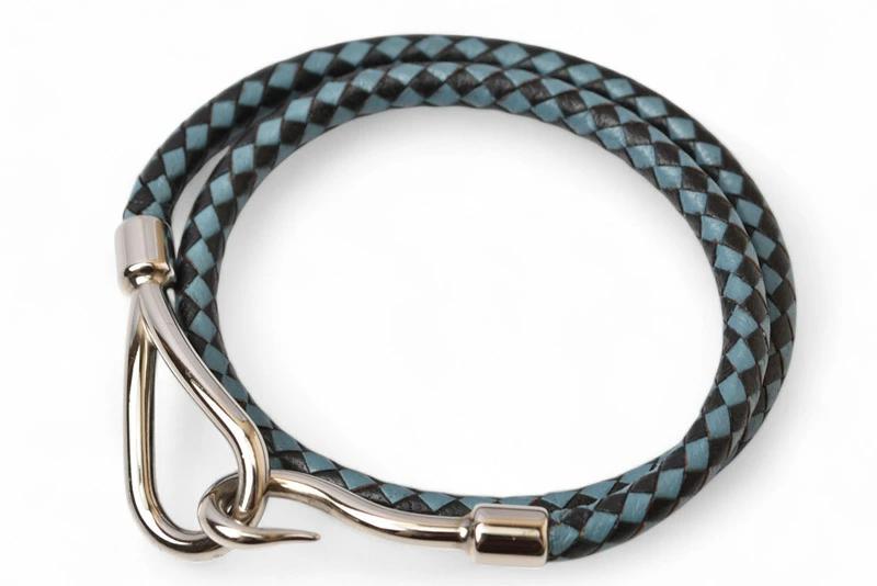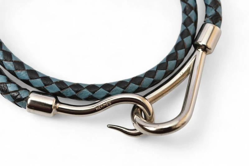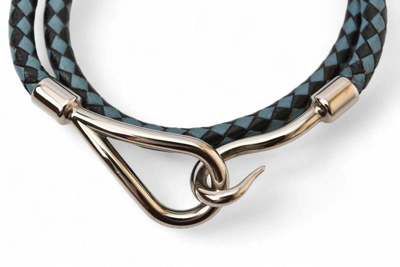 商品説明 | エルメスの中でも根強い人気を誇るジャンボフックブレスレット。存在感のあるシルバーカラーのフック金具と、しなやかなレザーが組み合わさったデザインは、カジュアルからフォーマルまで幅広いスタイルにマッチ。ブラック/ブルーのカラーリングは、爽やかさと大人の落ち着きを両立し、手元に上品なアクセントをプラスします。 |