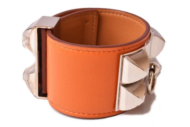 エルメスより、人気のバングル、メドール コリエドシアン バングルです。エルメスの象徴、メドール金具と大きなスタッズがアクセントに。ゴージャスな印象の存在感の有るブレスレットです。さりげなく上品な大人の雰囲気。