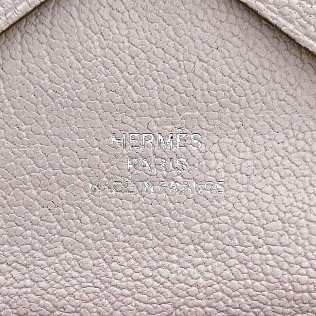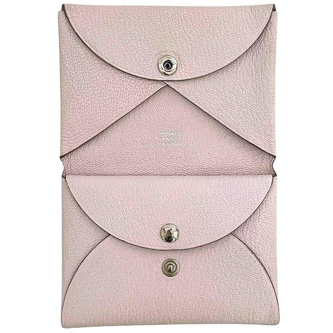 エルメス 二つ折り 財布 カルヴィ デュオ f-23964 ピンク モーヴルペール コインケース レザー シェブルミゾル 中古 U刻印 2022年 HERMES ホック コンパクト 小銭入れ ヴィンテージ 薄ピンク 人気 定番 お洒落 上品 シンプル エレガント ブランド 本物 鑑定済み