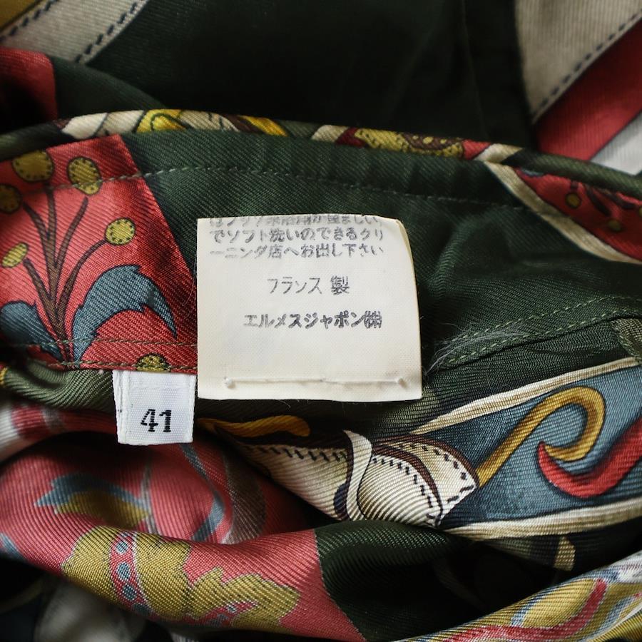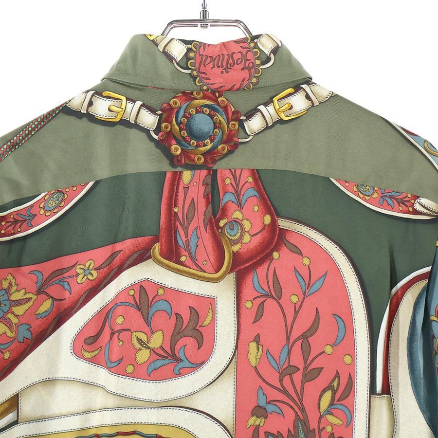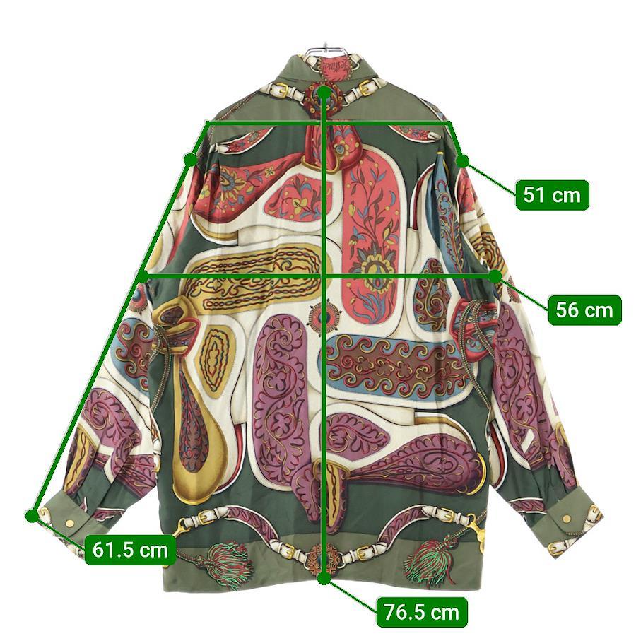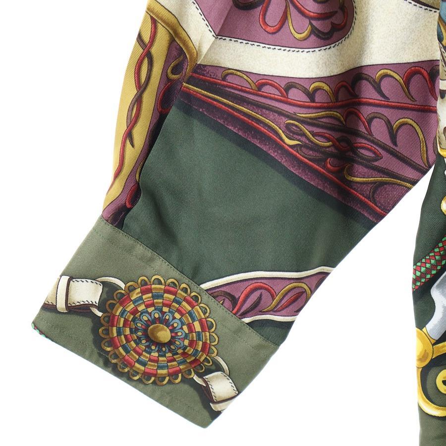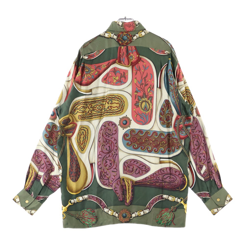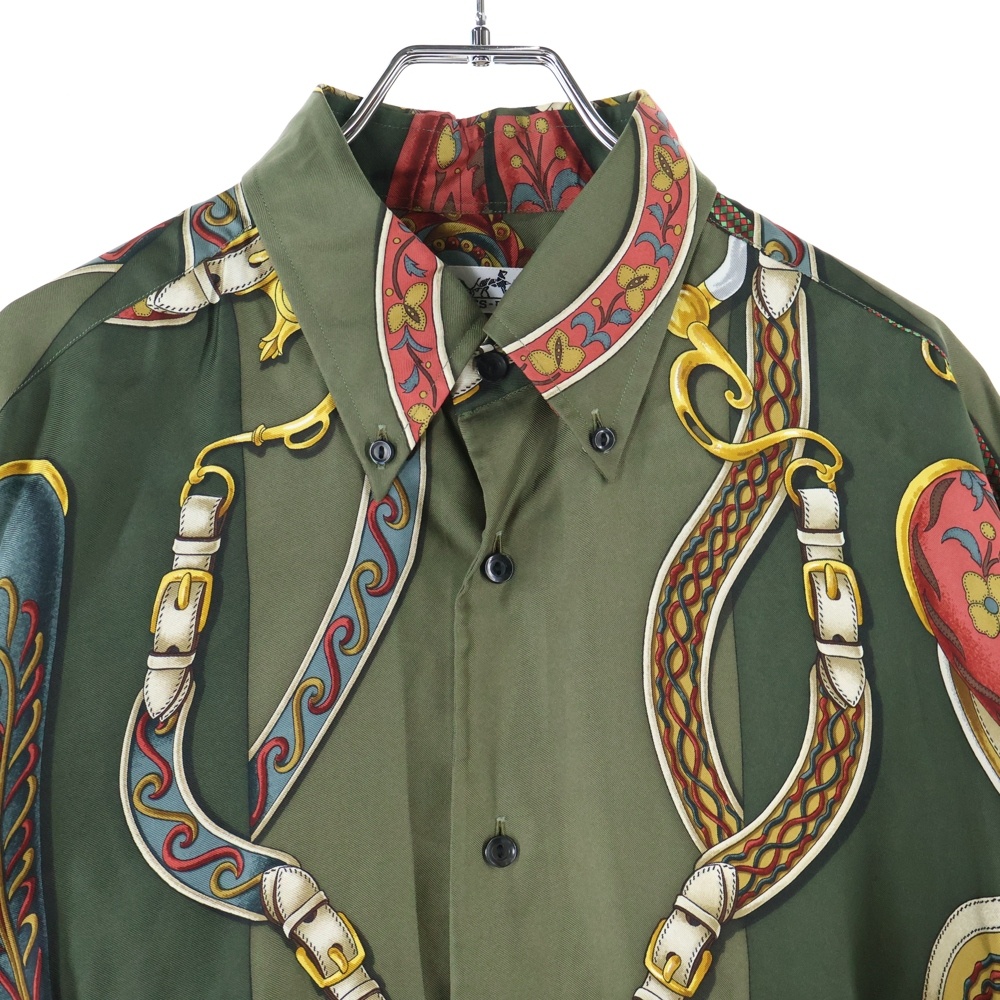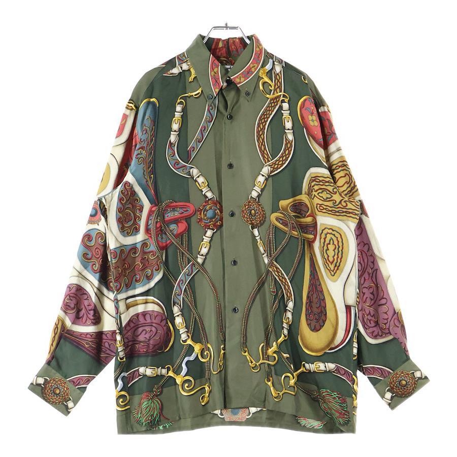 [モデル]馬具 総柄プリント セリエカフスボタン シルク ロングスリーブ 長袖シャツ カーキ/グリーン