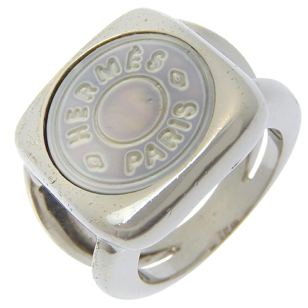 Pre-owned Hermès Corozo Series ring, size 9.5, BIJOUTERIE FANTAISIE, made of metal and shell, silver, approximately 9.8g, for women.
