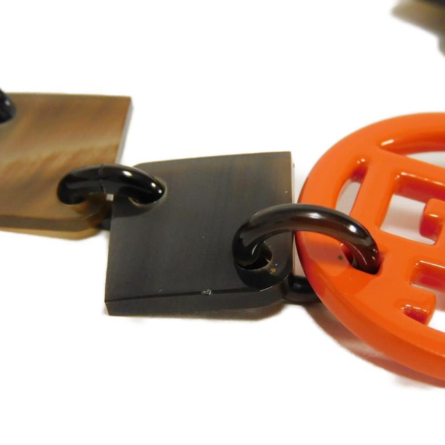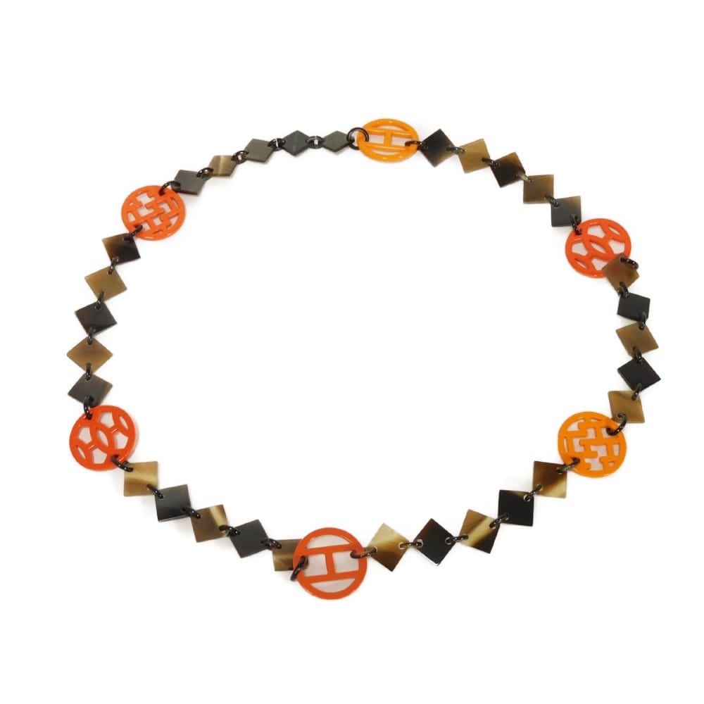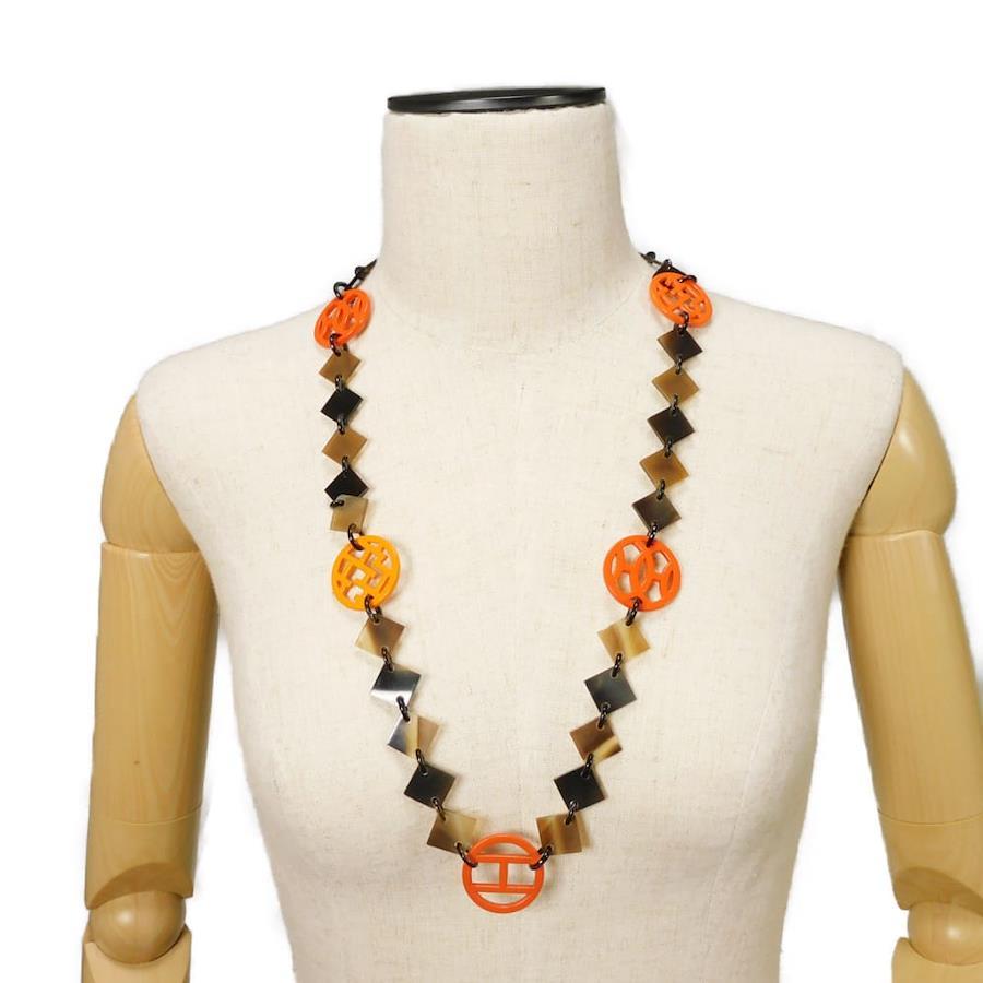 | 天然素材のバッファローホーンにラッカー仕上げを施した、マーブル柄のような風合いのチェーンにエルメスのHマークなどのモチーフがあしらわれた「アヴァ」ネックレスです。 |