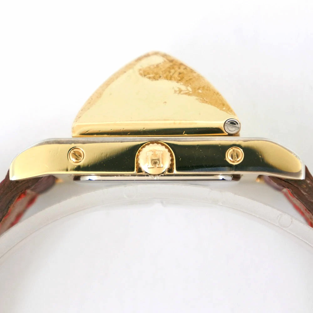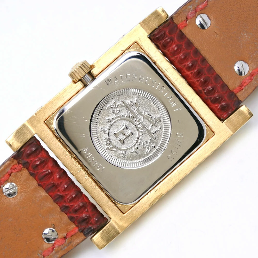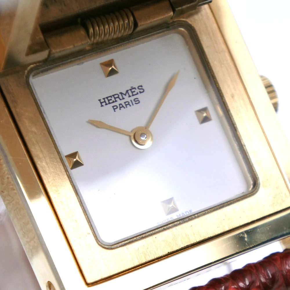 Pre-owned Hermès Medor women's watch with gold-plated leather strap, gold-plated quartz movement, analog display, white dial.
