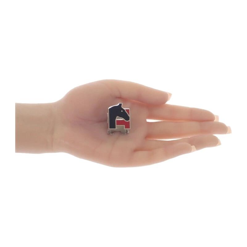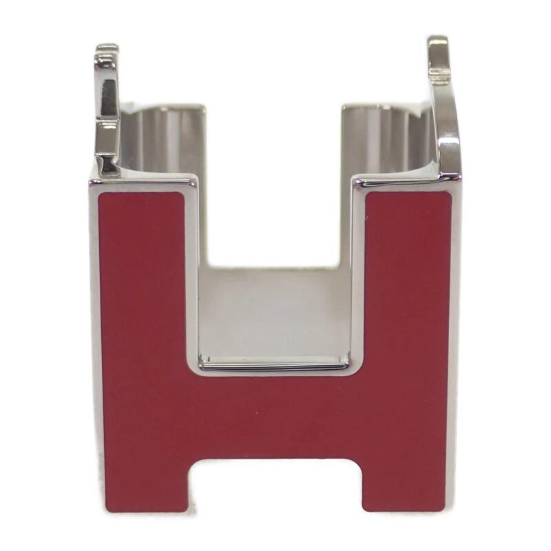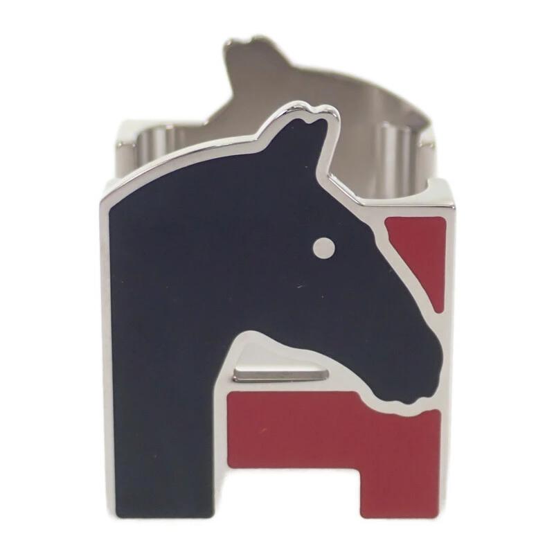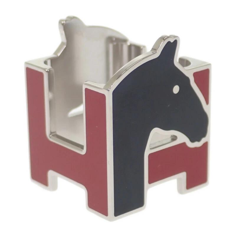 エルメスのアイコンである“H”モチーフと、馬のシルエットを取り入れたデザインが目を惹きます。ブラックにレッドのアクセントが効いた配色は、クラシックでありながらモダンな印象を演出。艶やかなメタル素材がスカーフスタイルを上品に格上げしてくれる、ひとつ持っておきたいアクセサリーです。