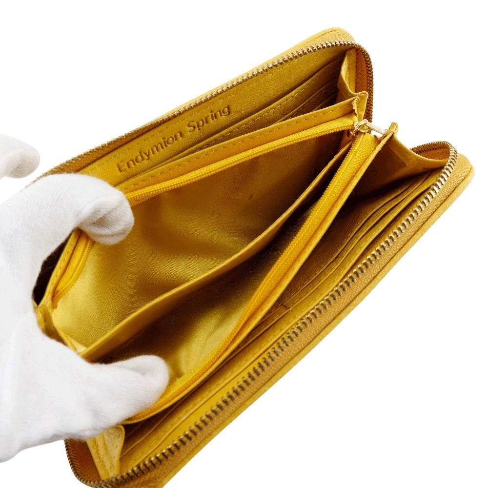 Endymion Spring Genuine Leather Embroidery Long Wallet with Round Zipper, Yellow, Women's, Pre-owned, A+ Rank