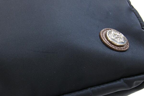 状態:外側:ナイロン部分に小キズ、スレ、薄スレ汚れあり。レザー部分所々スレ、フチにコーティング割れあり。正面レザー付け根に糸飛び出しあり。内側:薄スレあり。金具:小キズ、スレあり。