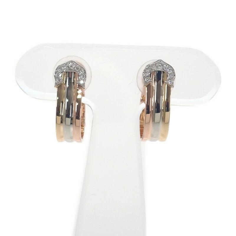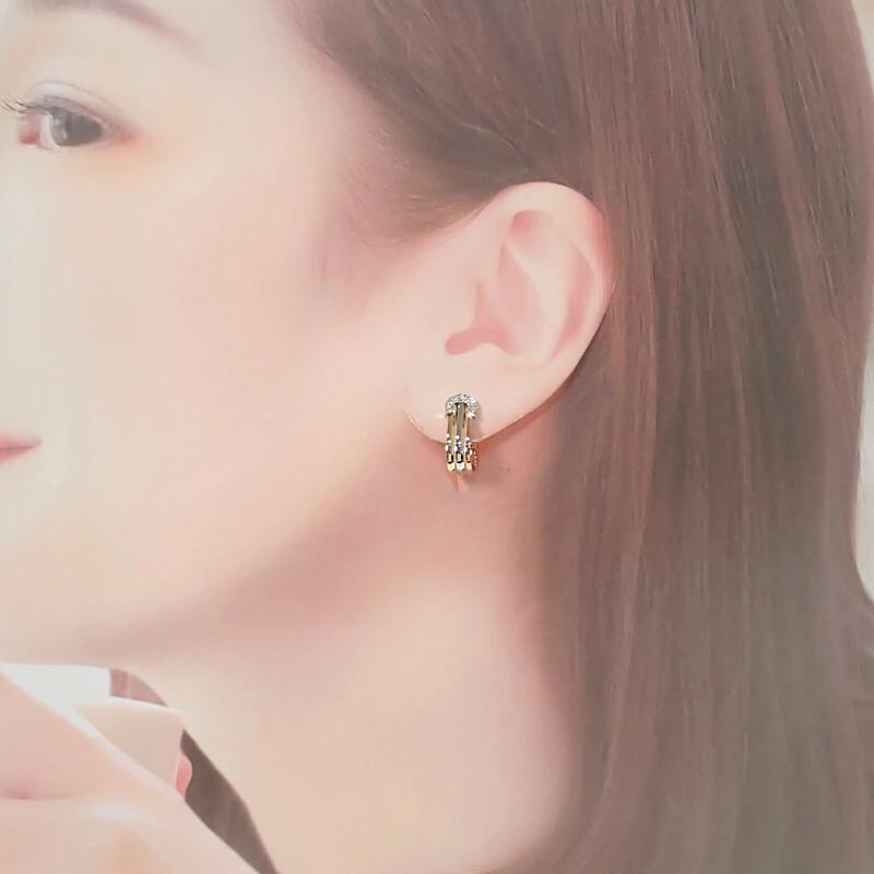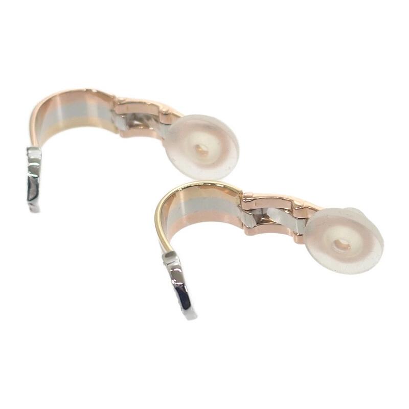 イエローゴールド、ピンクゴールド、ホワイトゴールドの3カラーゴールドが流れるように組み合わされ、動くたびに豊かな光沢を放つフープイヤリングです。