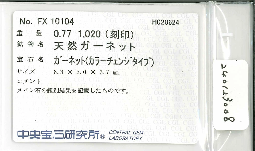 | 石目 | 0.77/1.020 刻印 (チェンジカラーガーネット 1石0.77ct×ダイヤモンド 計1.020ct) |
