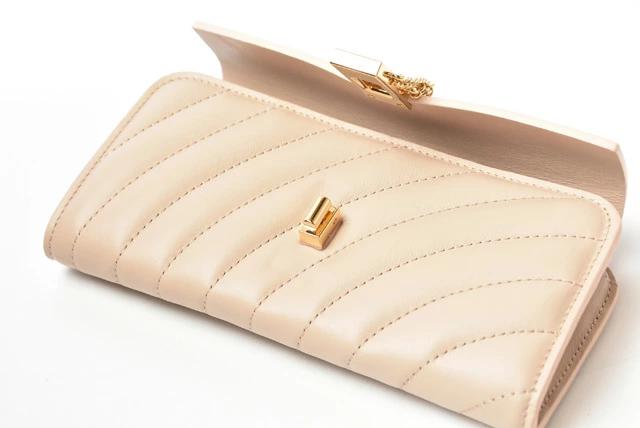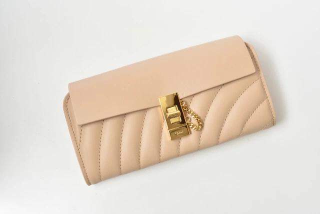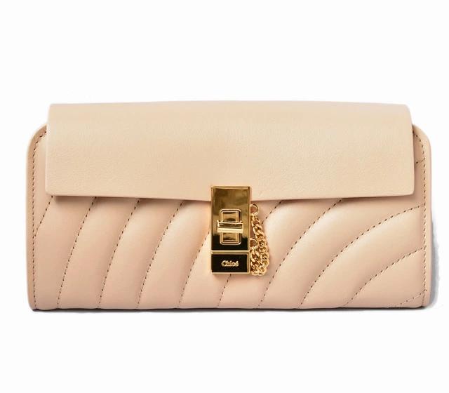 クロエより、ドリューラインの長財布です。手触りのよいラムスキン素材で高級感があります。ゴージャスなチェーン使いがアクセントになり印象的です。メタルに入ったロゴは高級感があります。女性らしいフェミニンな印象。内側は上品なベージュレザーがアクセントに。充実の収納で、財布の中身が多くなりがちな方も、すっきり整頓できます。