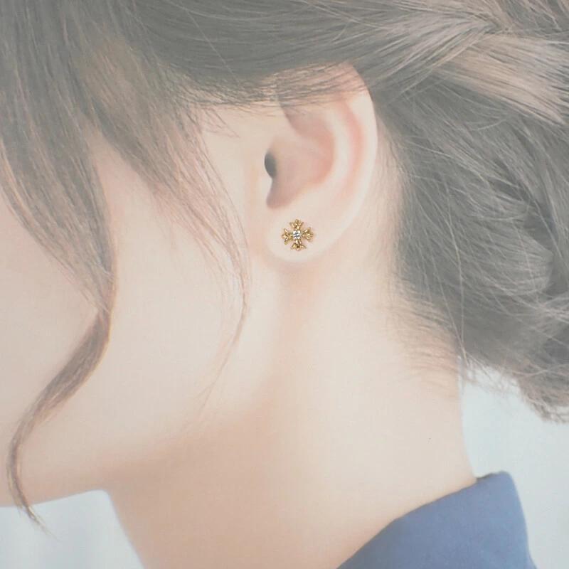 モチーフは22金、ポストは14金、キャッチは18金と贅沢に3つのゴールドで構成されており、シンプルながらも気品を感じさせます。