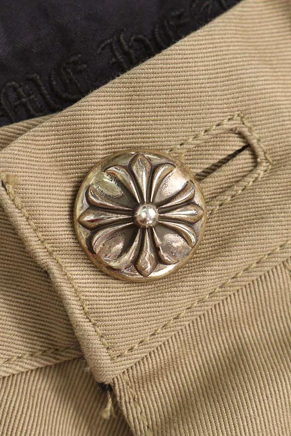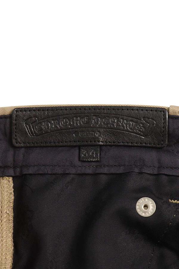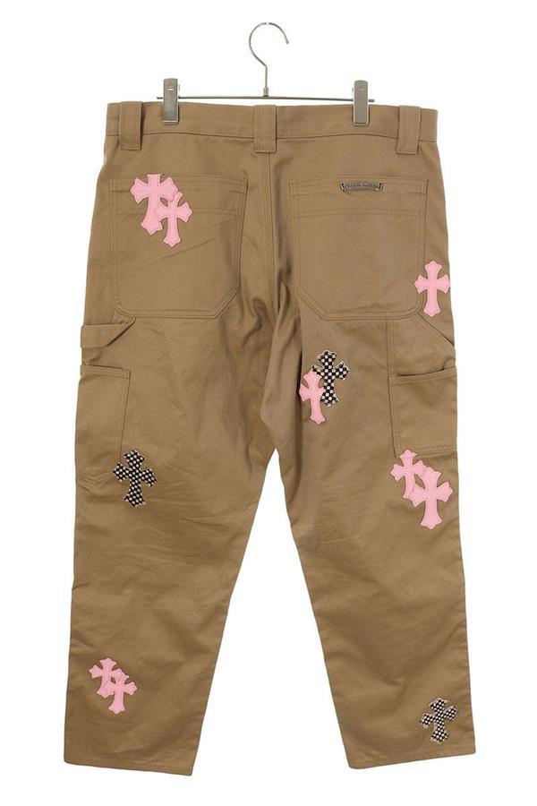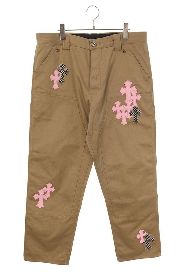 ブランド:クロムハーツサイズ:34インチ色:ベージュ×ピンク実寸:ウエスト幅45.5cm 股上32.5cm ワタリ幅37cm 股下76.5cm 裾幅22cm重さ:-素材:(表地) コットン (パッチ部分) 牛革付属品:なしその他特徴:ボタンフライデザインです管理番号:10829-251022-0031