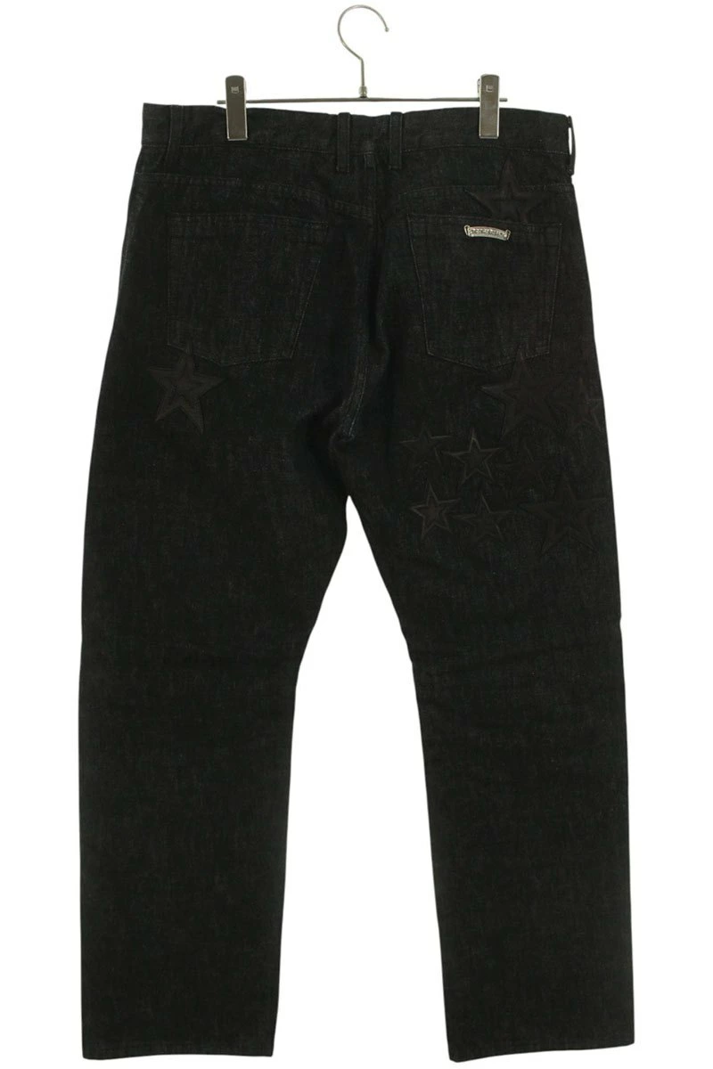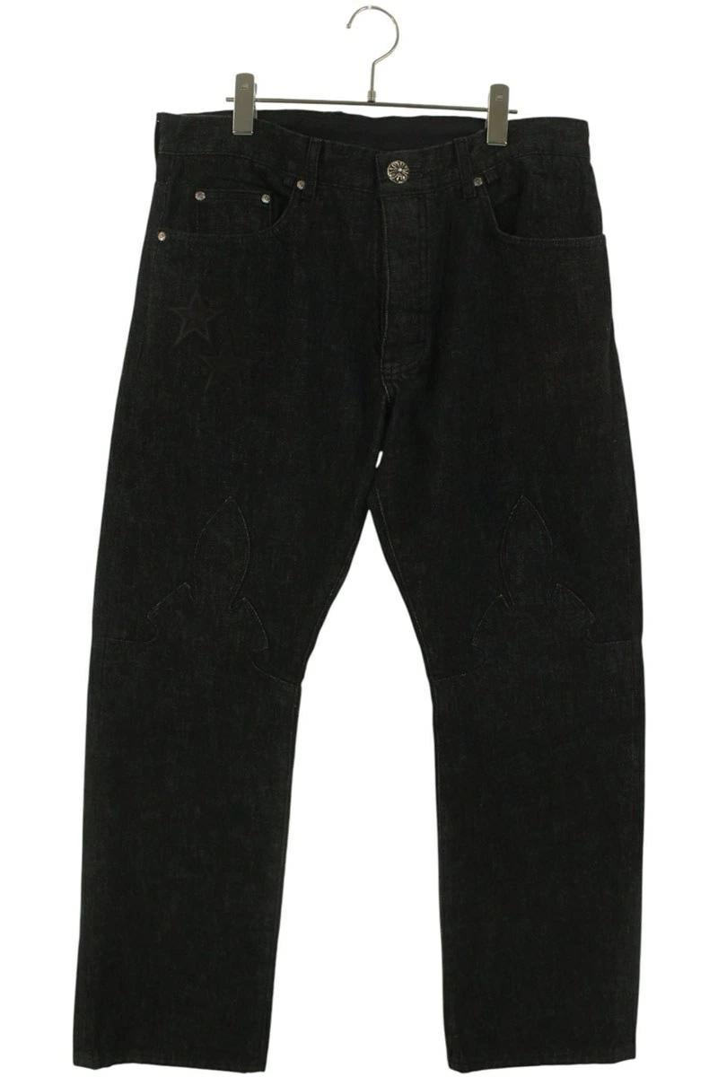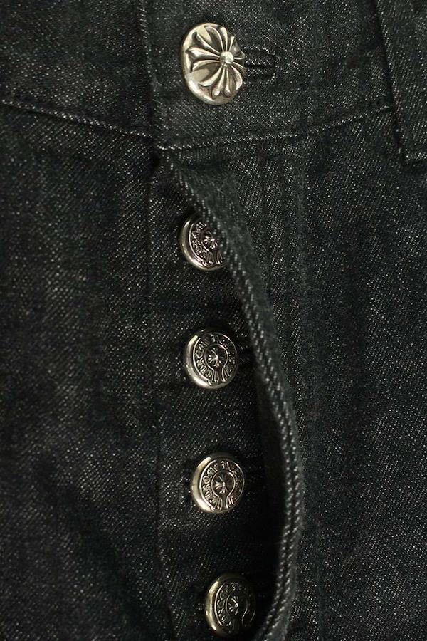ランク:B (使用感がある商品)状態備考:全体的に擦れや毛羽立ちがありますブランド:クロムハーツサイズ:36インチ色:ブラック×シルバー実寸:ウエスト幅42cm 股上29cm ワタリ幅35cm 股下78cm 裾幅22cm重さ:-素材:(表地) コットン (革) 羊革付属品:なしその他特徴:ボタンフライデザインです管理番号:10831-251013-0042