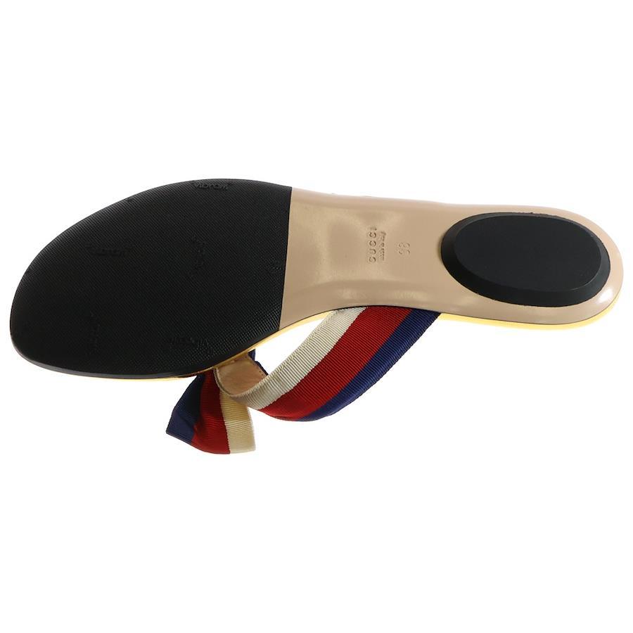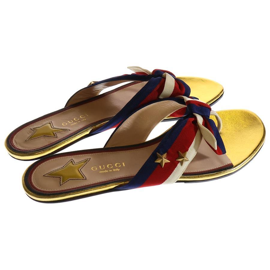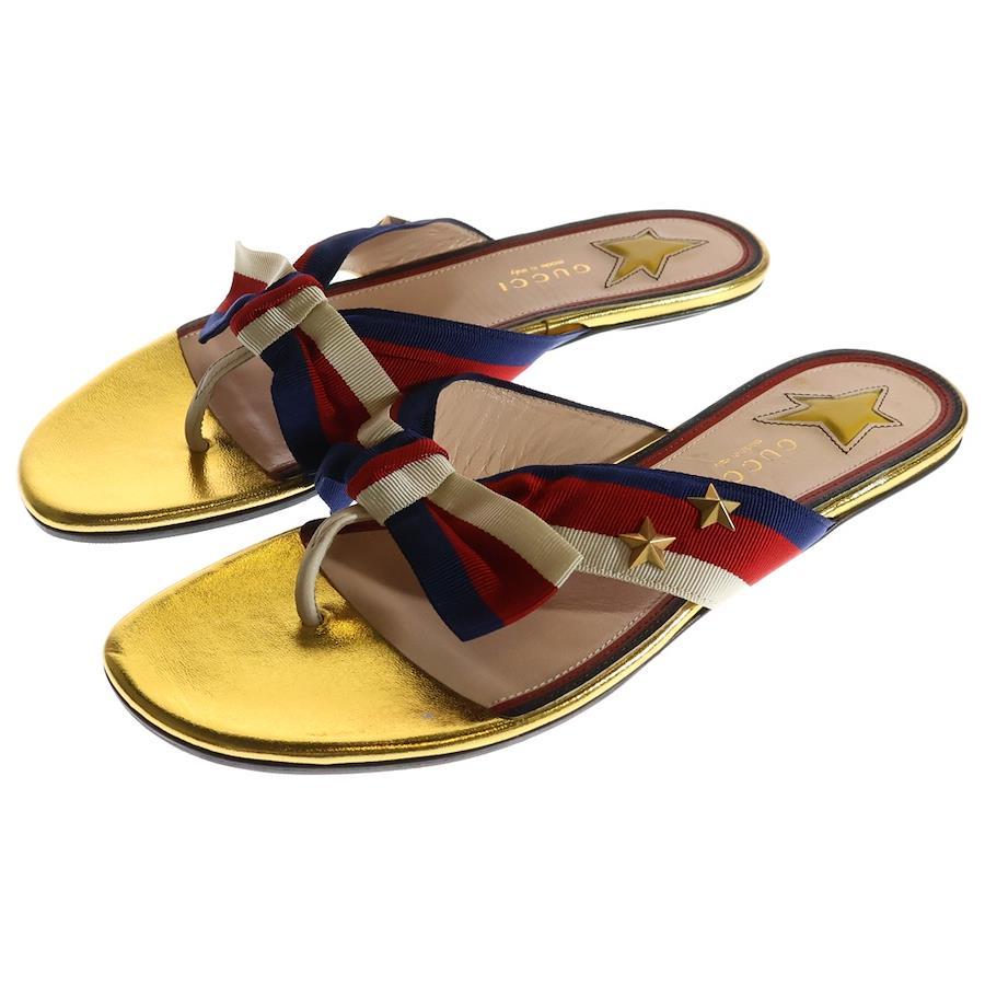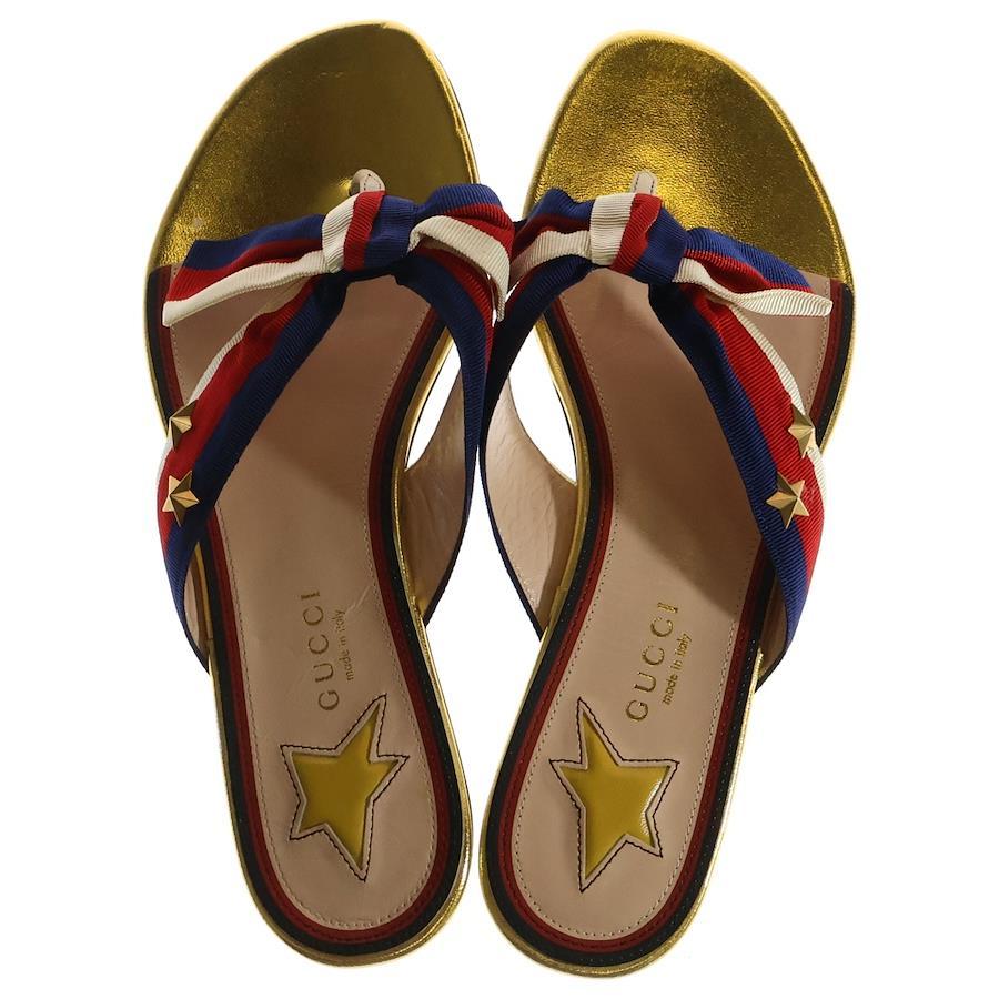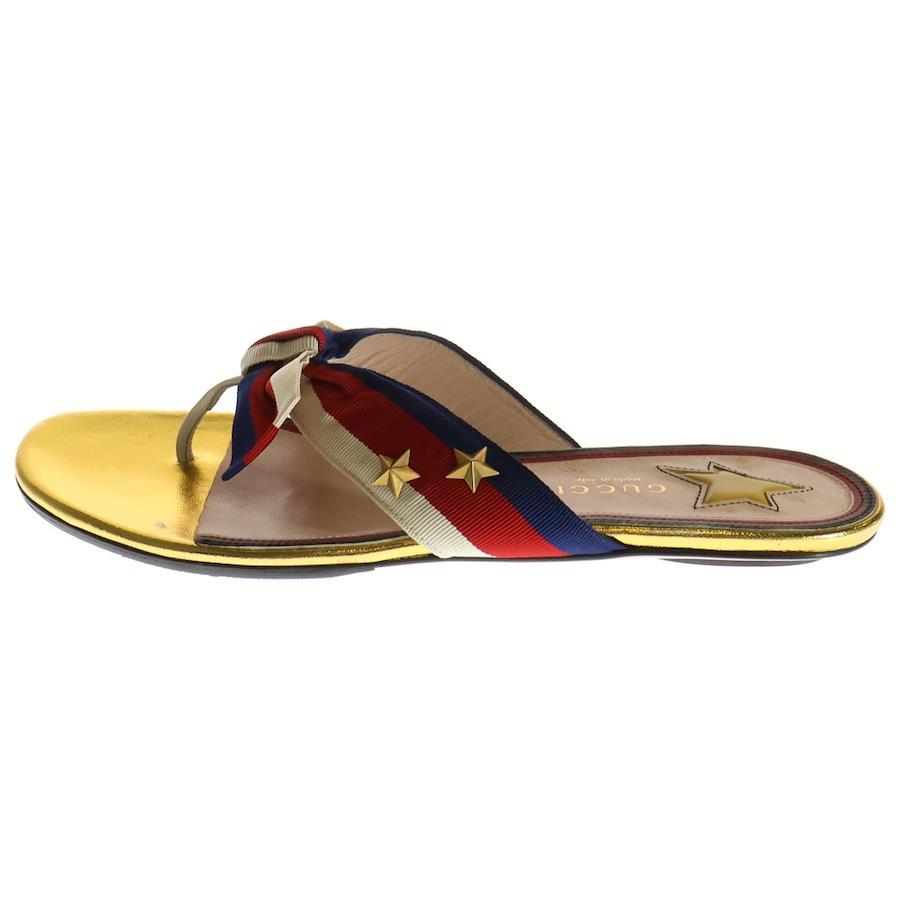 [モデル]ウェブライン トリコロール リボン レザー スター スタッズ フラットサンダル ゴールド/レッド レディース