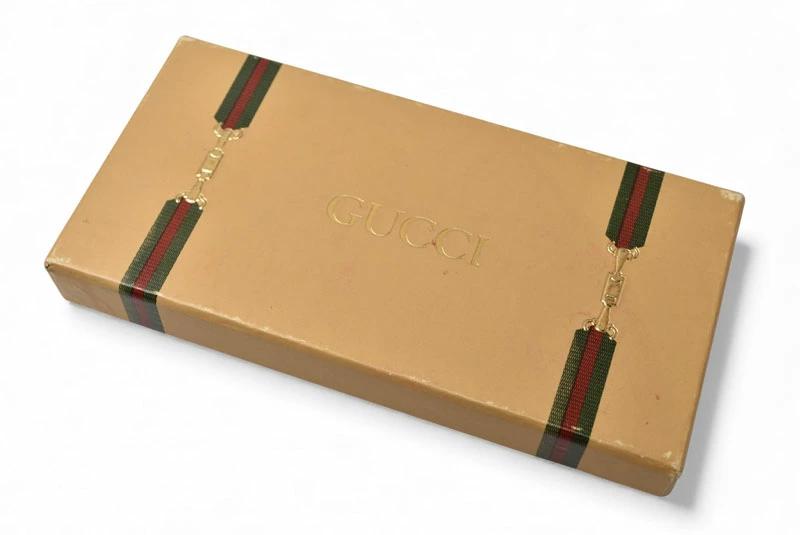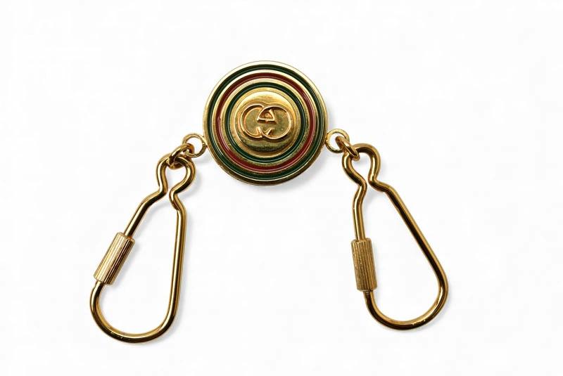 グッチ(GUCCI)の人気ディテール、シェリーライン × GGロゴ を組み合わせたヴィンテージキーリングです。存在感のある ゴールド金具 に、グリーン×レッドのシェリーラインが映えるクラシカルなデザイン。ワンポイントのアクセサリーとして楽しめます。ヴィンテージならではの雰囲気が魅力で、年代を超えて愛されるアイテム。GUCCIファンには特に人気の高いデザインです。