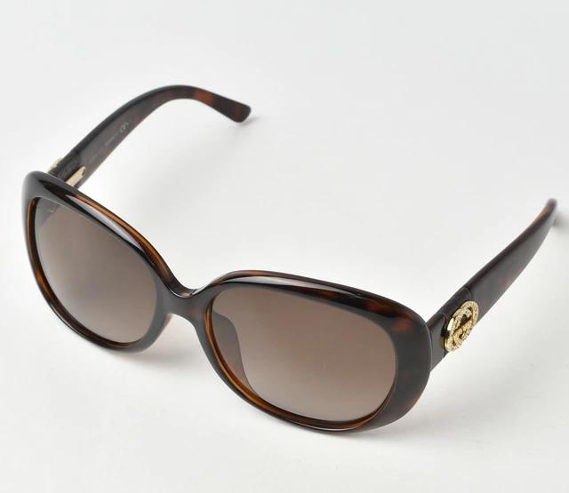 グッチより、サングラスです。左右の耳かけフレーム(テンプル)にGGロゴのマークがデザインされております。ラインストーンがゴージャスな印象に。アクティブでお洒落なデザインのサングラスです。大き目のレンズで紫外線をカットしてくれます。