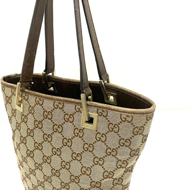 コメント:グッチ定番・人気のGGキャンバスにレザーと金具のアクセントが効いたオシャレトートバッグ。カジュアルながらエレガントさも兼ね備えたお品物です。
