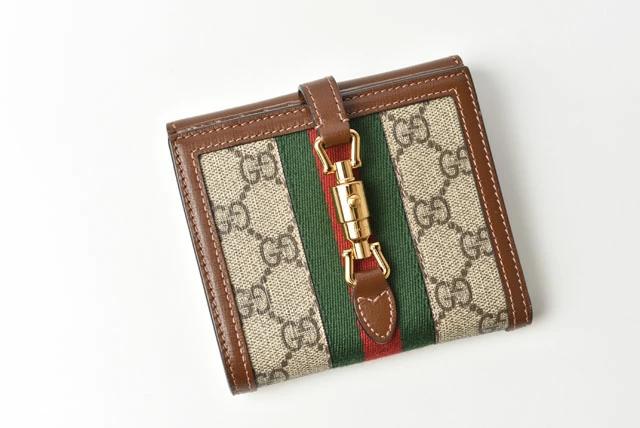 グッチより、ジャッキーの折財布です。使いやすさに定評のあるダブルホック式。多くなりがちなコインは、たっぷり収納できます。札入れも2層に分かれており、使いやすいデザインです。小銭入れとお札が別々に収納できるデザイン。コンパクトにまとめながら機能性は十分。コンパクトながら収納力も抜群で、使いやすい。