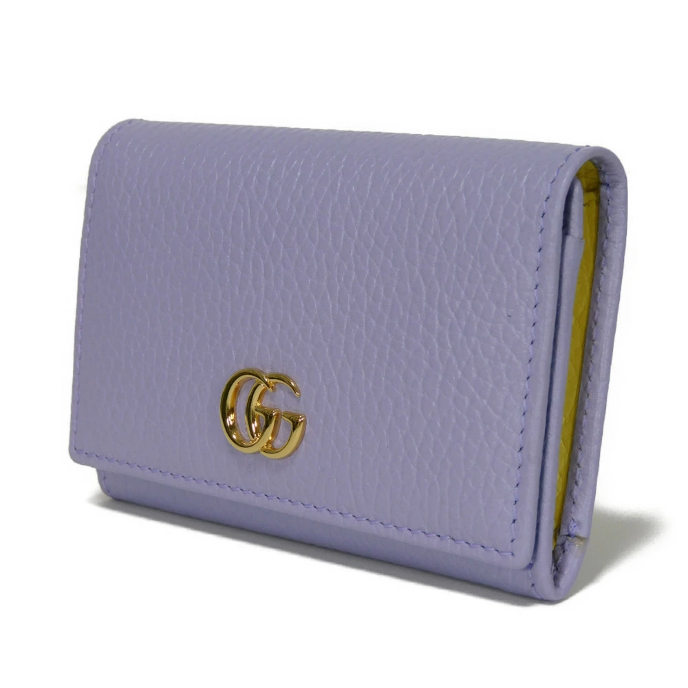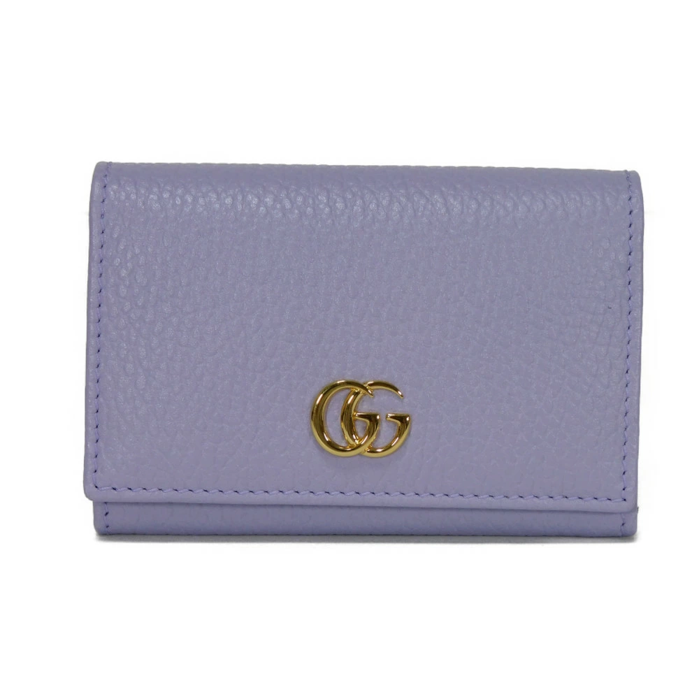 型押しが施された、カーフレザーにグッチのGGメタルがあしらわれた「ダブルG バイカラー カードホルダー」スナップ式二つ折りカードケースです。 |