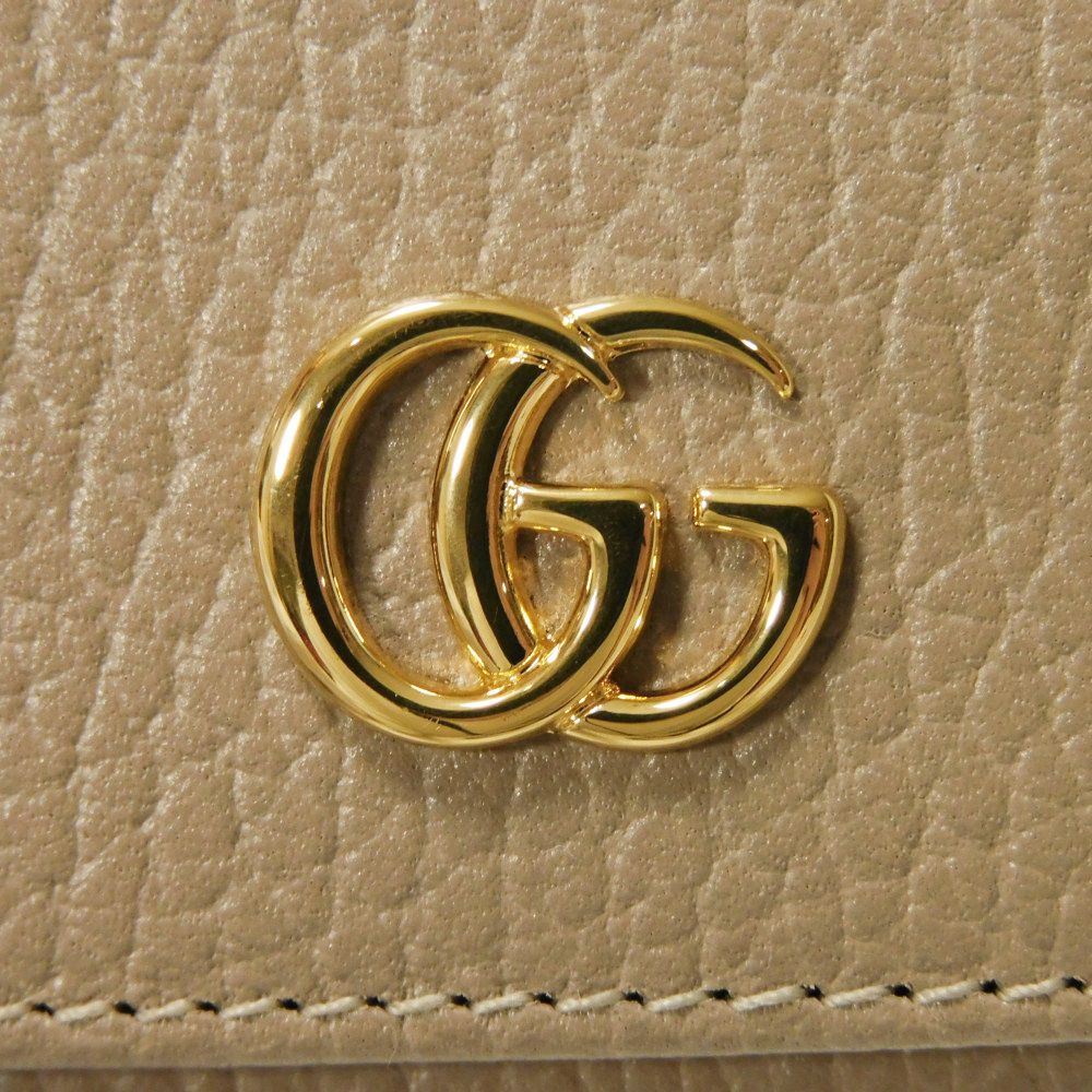 グッチのGGメタルがあしらわれた、型押しカーフレザーにライニングカラーを組み合わせた「ダブルG バイカラー カードホルダー」スナップ式二つ折りカードケースです。 |