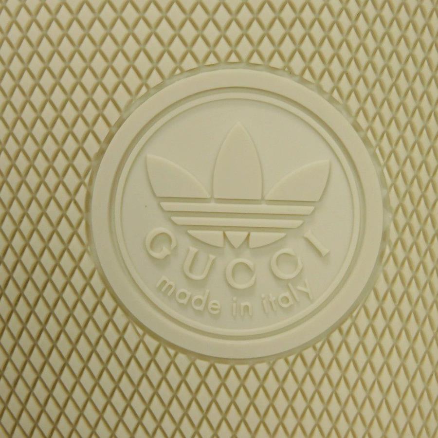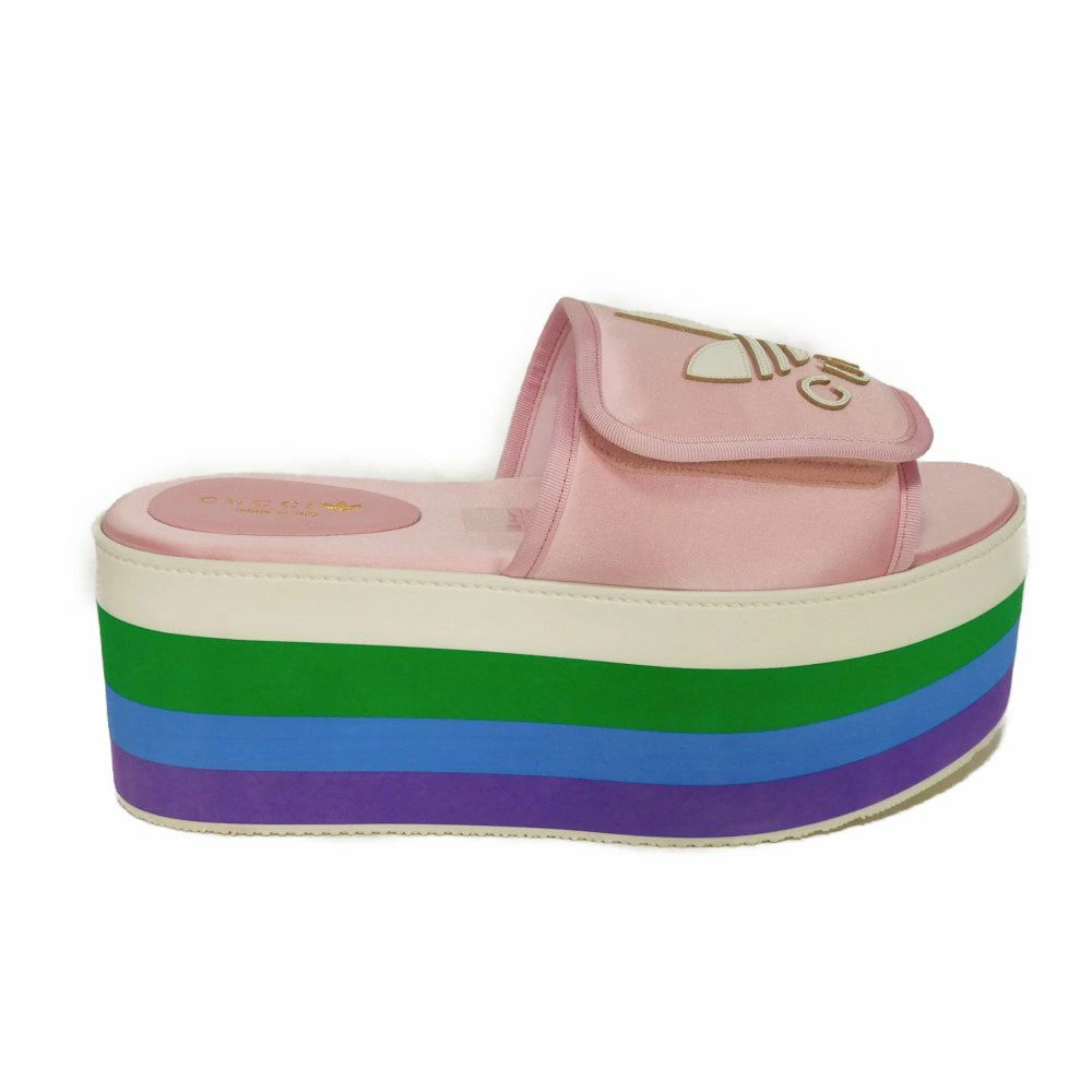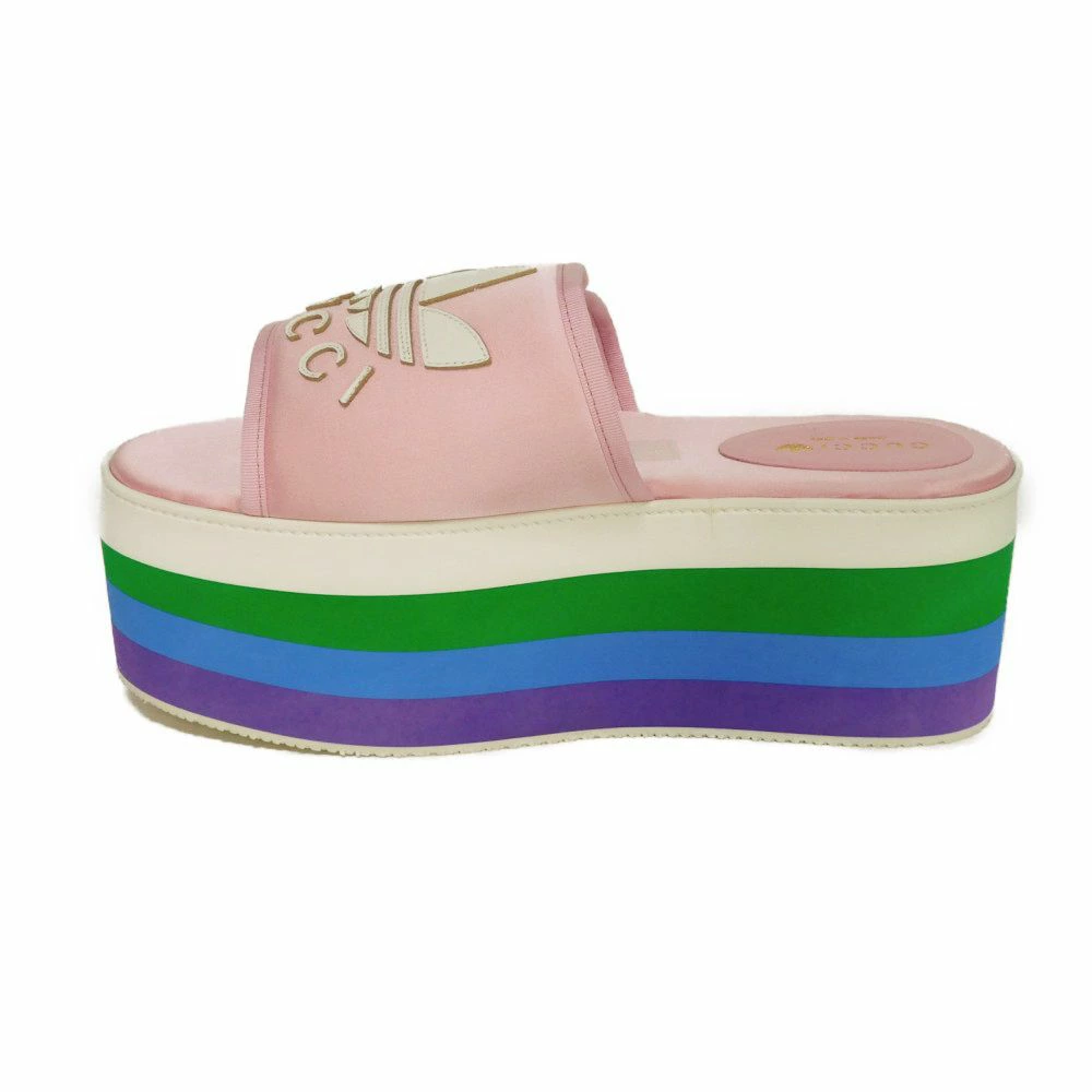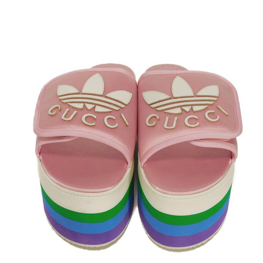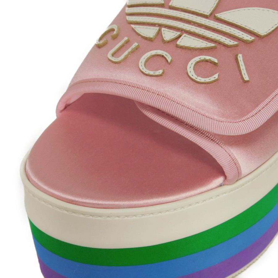| シルク素材にグッチのロゴとアディダスのモチーフがあしらわれた「トレフォイル プラットフォーム」厚底サンダルです。 |
