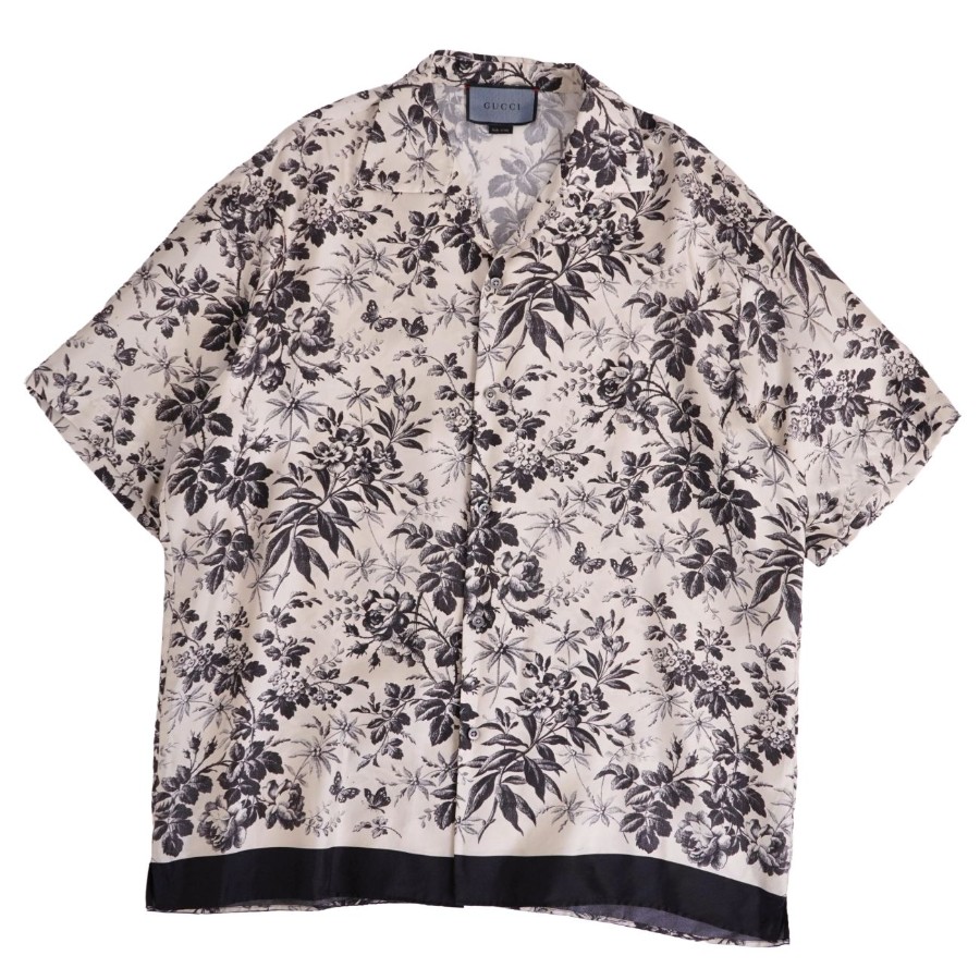 グッチ GUCCI シャツ ボーリングシャツ ショートスリーブ 半袖 フローラ ボタニカル シルク トップス メンズ イタリア製 ベージュ/ブラック サイズ56(XXL相当)