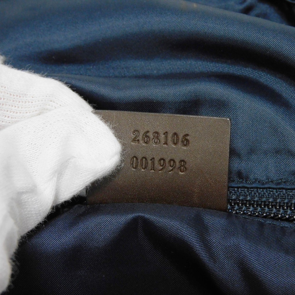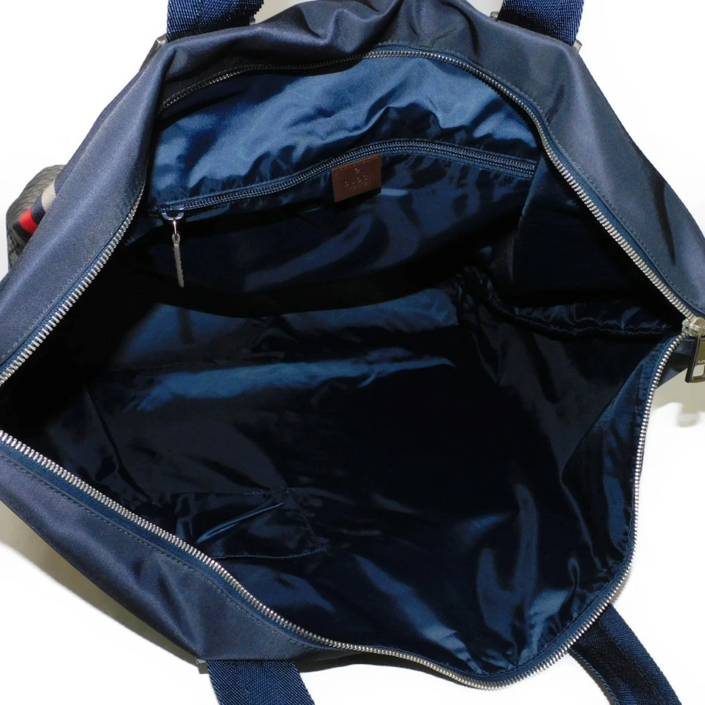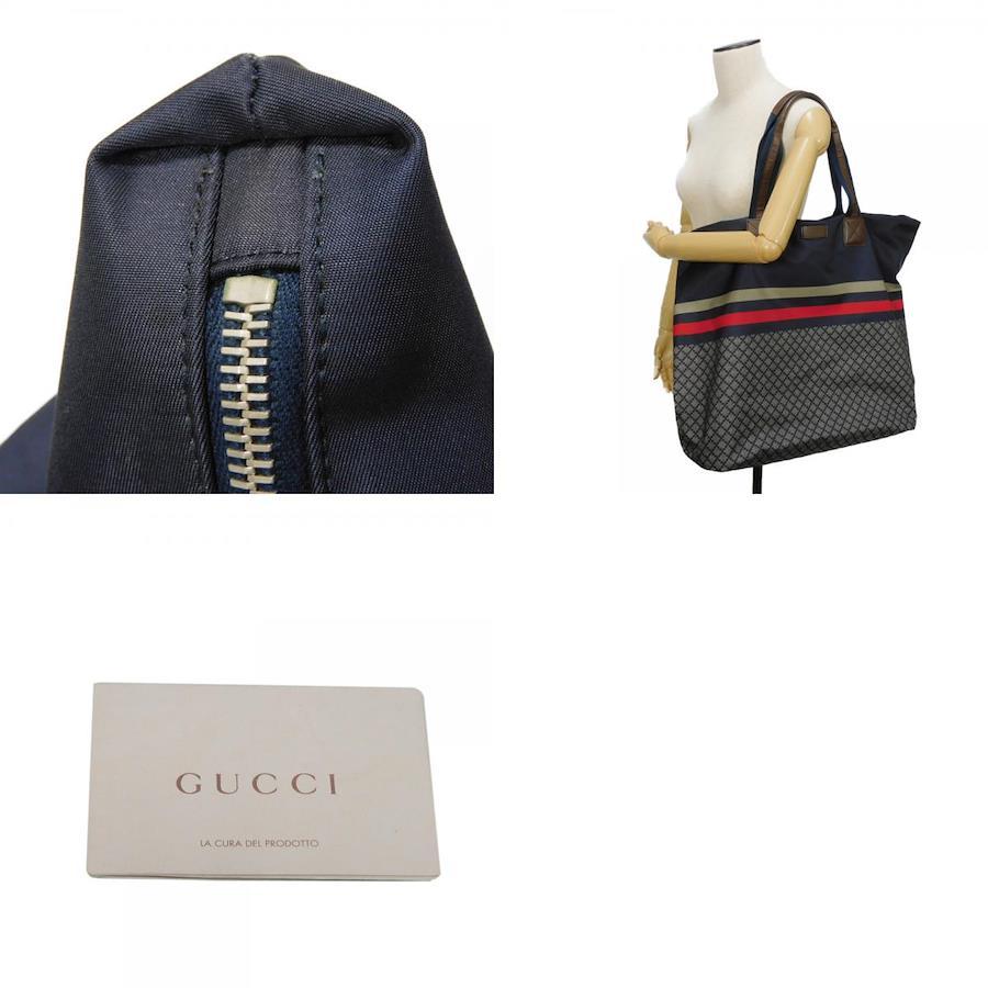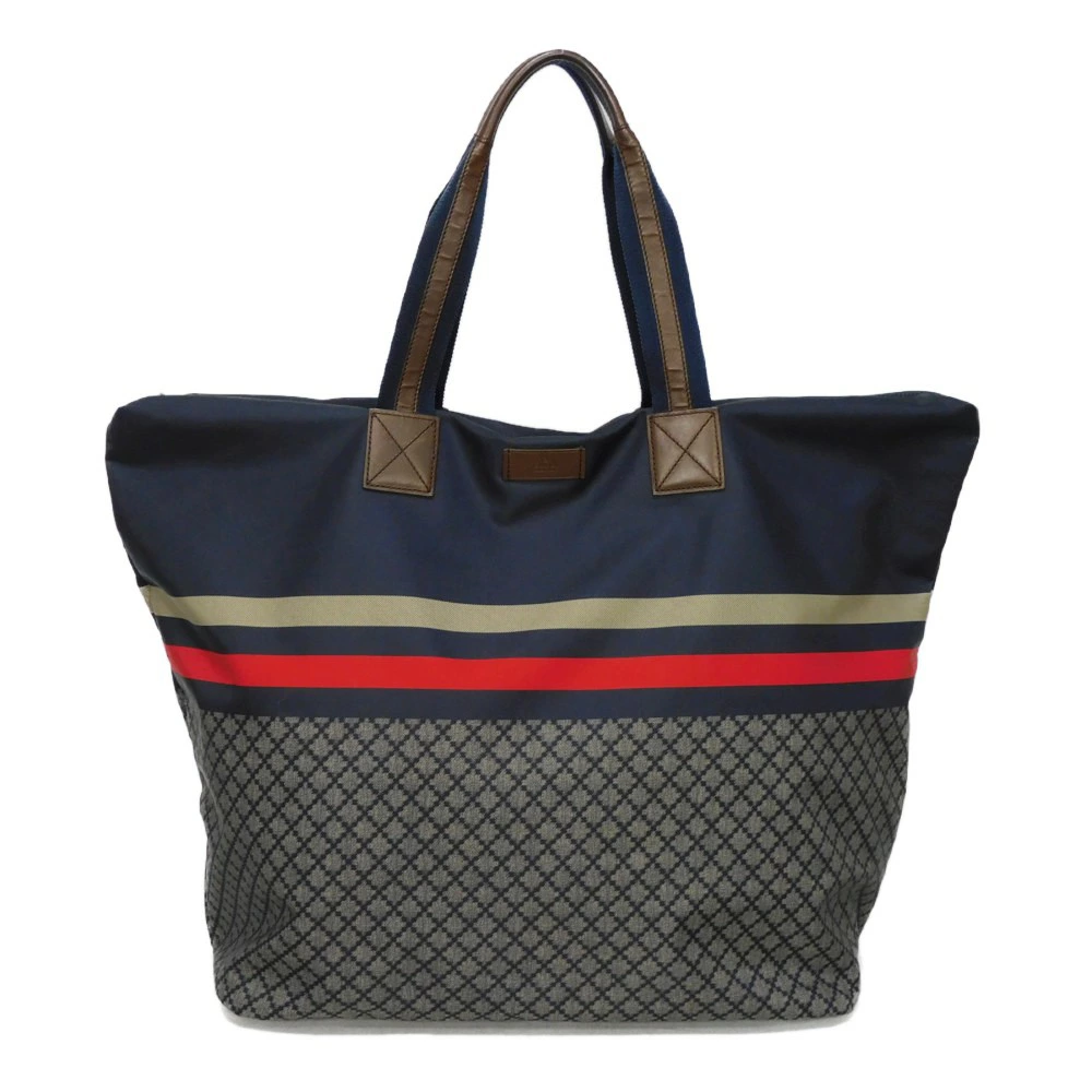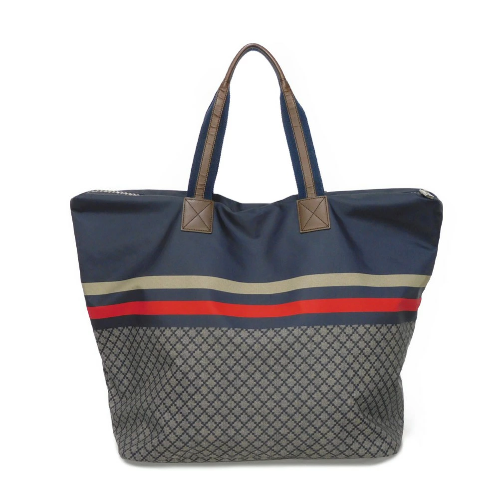 ディアマンテパターンとウェブストライプがプリントされたナイロン素材にグッチのロゴが刻印されたレザーパッチを組み合わせた「ディアマンテ トート」トートバッグです。 |