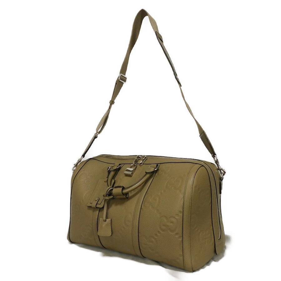 | 型押しカーフレザーにグッチのGGパターンがエンボス加工された「ジャンボGG ミディアム ダッフルバッグ ベージュ」ボストンバッグです。取り外し可能なストラップでショルダーバッグとしてもお使いいただけます。 |